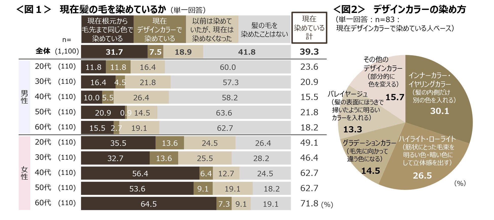 女性20~30代ではデザインカラーで染めている人が13.6%と他の層より高い。デザインカラーで染めている人の中では、「インナーカラー・イヤリングカラー」と「ハイライト・ローライト」が各3割前後。<図1・図2>