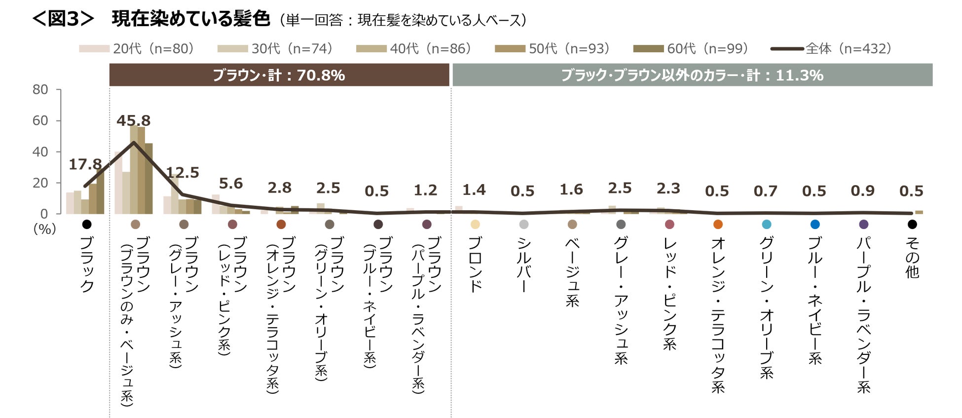 現在の髪色は、「ブラウン計」が70.8%で大半を占め、その中でも「ブラウン(ブラウンのみ・ベージュ系)」が45.8%。ブラック・ブラウン以外のカラーは11.3%。今後染めてみたい髪色は、ブラック・ブラウン以外のカラーは32.4%。