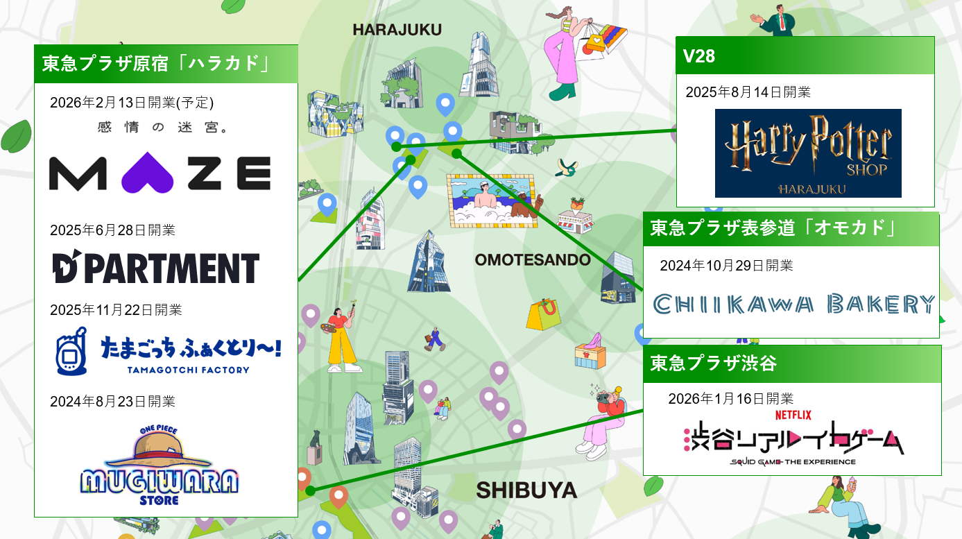 原宿・神宮前エリアにおいては、ハラカドにて、 世界初の常設 K-POP 総合デパート「D'PARTMENT」や“体験”をコンセプトとした、たまごっちの常設店舗「たまごっち ふぁくとり~!」、『ONE PIECE』のさまざまなグッズやHARAJUKUオリジナルグッズを取り扱う「ONE PIECE MUGIWARA STORE HARAJUKU」を展開しています。ハラカドの隣に位置するビル「V28」では、ワーナーブラザース・ディスカバリーとして日本初の旗艦店となる「ハリー・ポッター ショップ 原宿」が昨年8月にオープンしました。ここでしか手に入らない魔法アイテムに加え、バタービールや限定フードなど、作品の世界観を体感できるメニューも取り揃えており、来街者の方へ魅力的な体験を提供しています。また、「オモカド」では、「ちいかわ」の世界観を感じながら、オリジナルパンを楽しむことができる「ちいかわベーカリー」を展開しています。