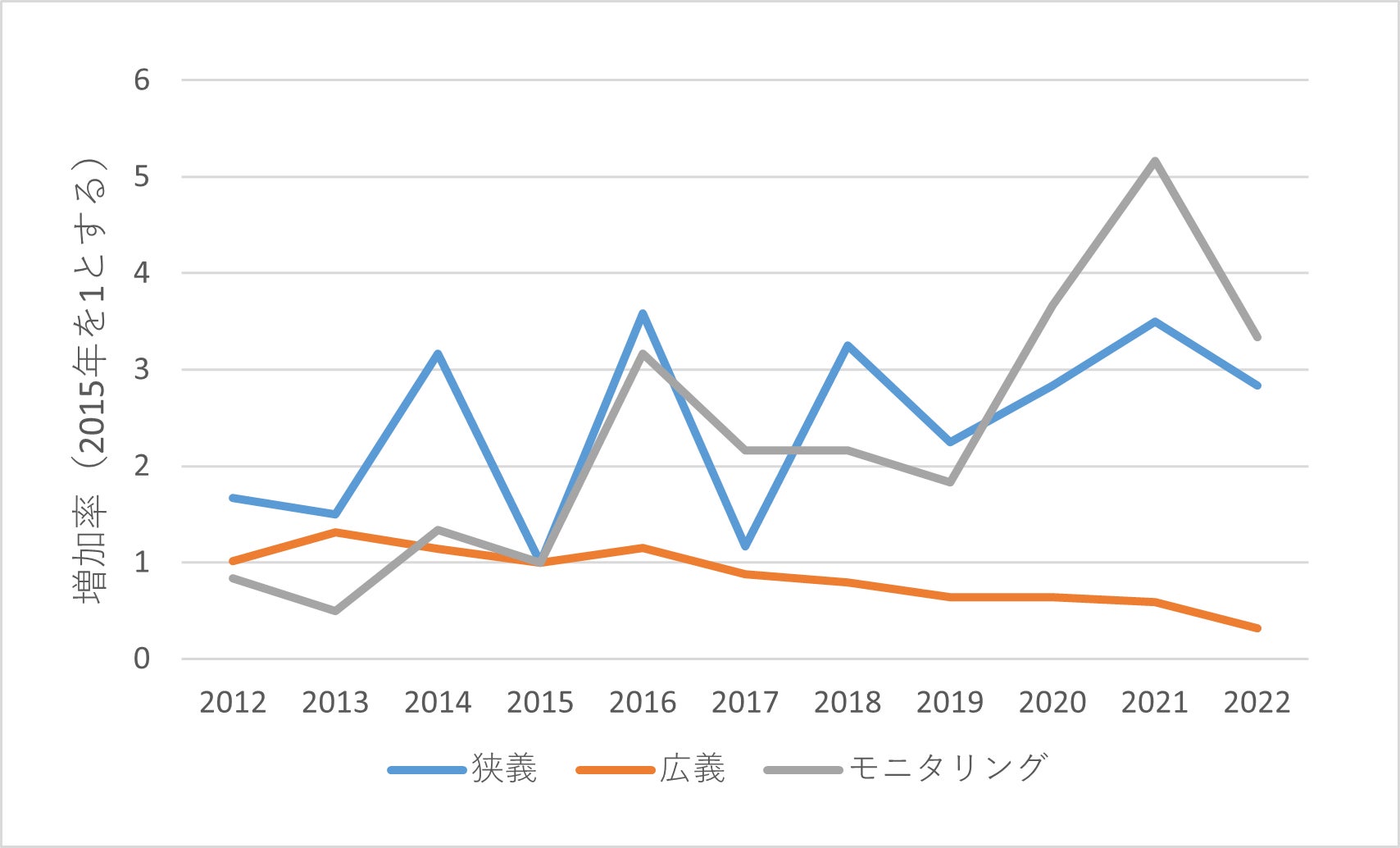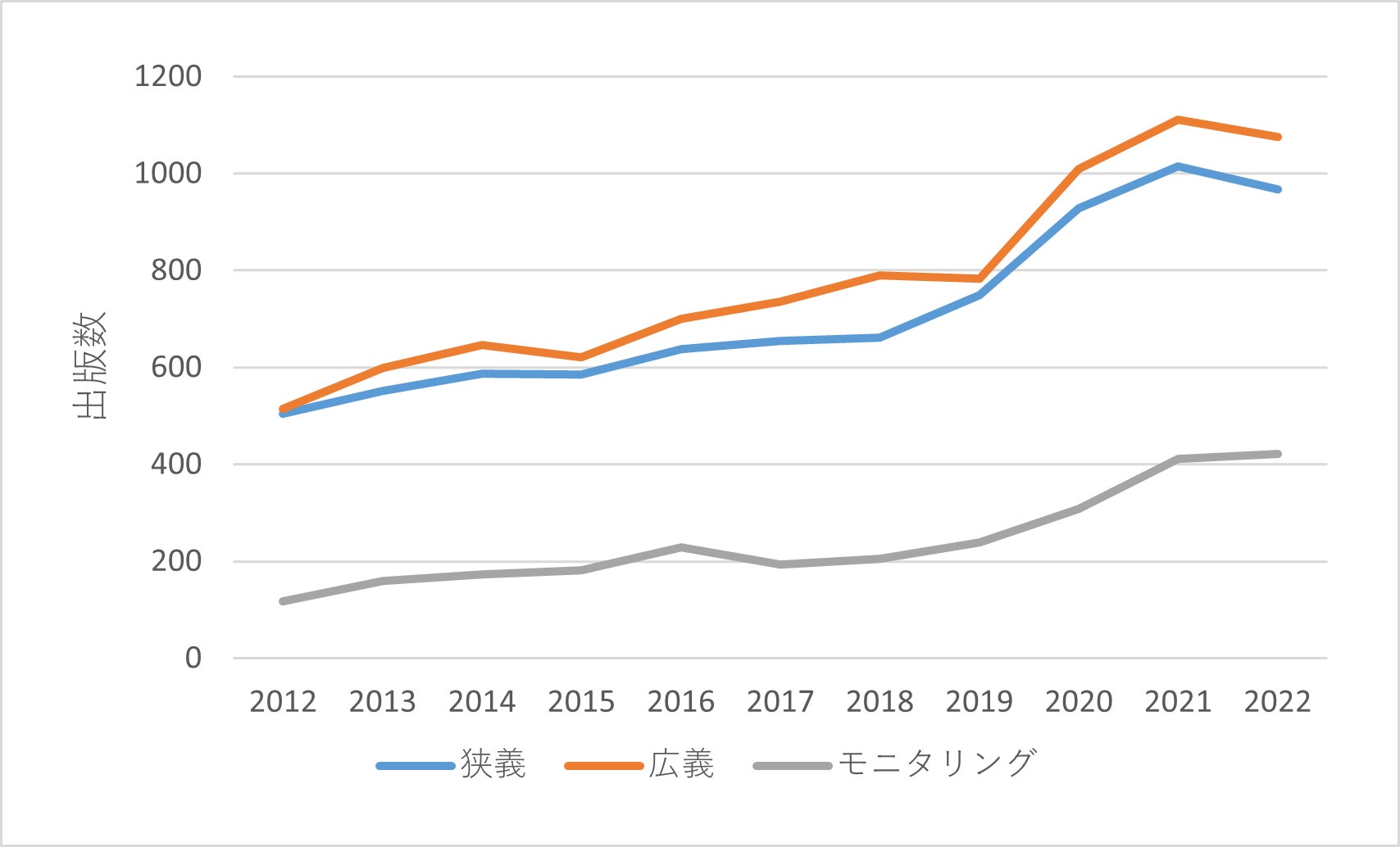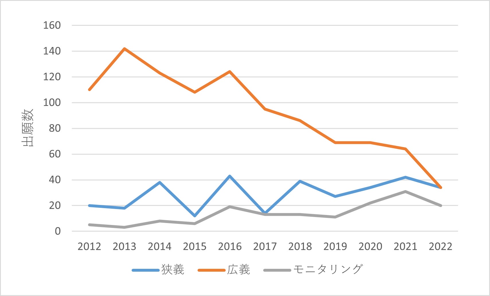 モニタリング領域では2022年の出版数が2015年出版数の約2.3倍と、広義と狭義領域の約1.7倍に比較して高い増加率となっています。絶対数では広義と狭義領域が多く、今後の技術革新の中心となると考えられますが、モニタリング領域にも注目はあつまっていることがみてとれます。
