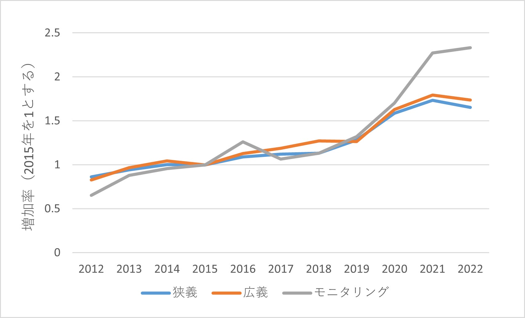 スタートアップ企業はあたらしい技術で社会に影響をあたえる企業であり、特許と同様、近未来における社会実装の指標といえます。狭義、広義、およびモニタリングの3領域における2012年以降のスタートアップ企業設立数の年次推移を図3にしめします。