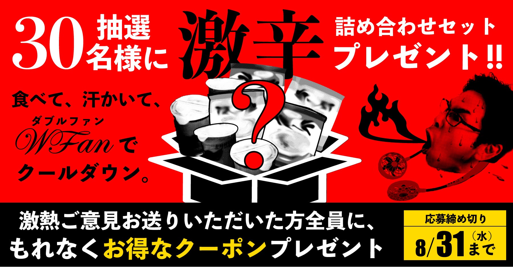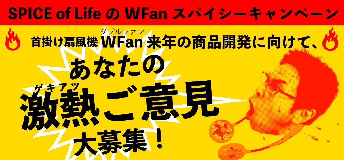 猛暑、コロナ、節電、値上がりラッシュ、過去最も世知辛い夏。みなさんはどうお過ごしでしょうか。年々暑さが増す日本の夏。そんな過酷な暑さを乗り切るためにWFanを愛用してくださっている方たちに来年は今よりもっと快適に過ごして欲しく来年のWFan商品開発に向けて、みなさまの激熱(ゲキアツ)ご意見を大募集します。「こんな時に便利だった」「こんなのが欲しい」「ここが残念だった」など、うれしい声も、厳しい声も、参考にさせていただきます。激熱(ゲキアツ)ご意見いただいた方にはもれなくお得なクーポンをプレゼント。さらにダブルチャンスで、抽選30名様に「激辛詰め合わせセット」をプレゼントいたします。