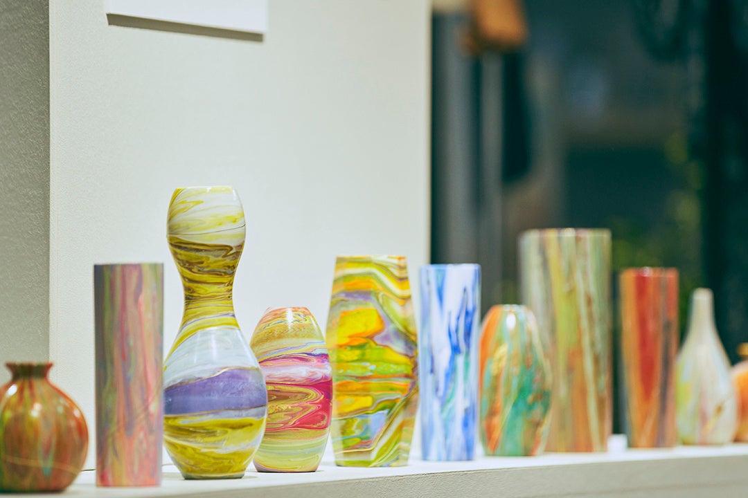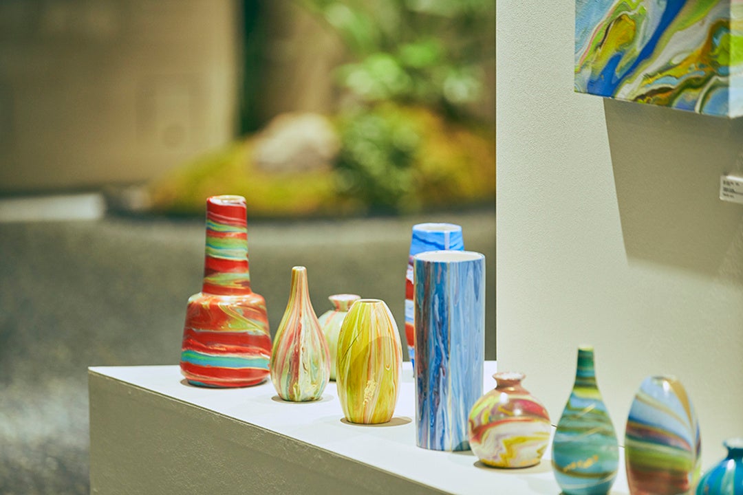フルイドアートのアーティストmadokaさんがこのPOP UP SHOPのために初めてフルイドアートのフラワーベースを創作。京都は仕事で訪れる機会も多いというmadokaさん、特別な思いで作品作りに臨んだそう。截金(きりがね)や金箔のあしらいで、どことなく和のニュアンスものぞくモダンなフラワーベース約30点を展示販売。