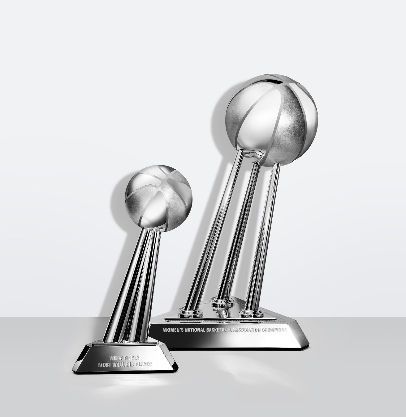 1997年のWNBA創設以来、WNBAファイナル優勝トロフィーとMVPトロフィーはティファニーによって製作された歴史を持ちます。ゲームボールが交互に配されたWNBAの象徴的なパネルに敬意を表し、両トロフィーの頂部には対照的な仕上げが施されたボールを配置しています。傾斜した脚部は、トロフィーの重量は約26ポンド(約11.8kg)、高さは約25インチ(約63.5cm)。ロードアイランド州にあるティファニーのホローウェア工房で手作業により製作され、約4ヶ月を要したクロフトマンシップの結晶です。さらに、チャンピオンシップトロフィーの台座には歴代優勝チームの名前が刻まれ、リーグの歴史を築いた先駆者たちを称えています。