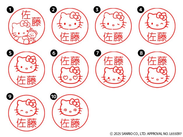 はんこのイラストはこちらの10種類。おすまししたり、ウィンクしたり、お友だちとなかよく遊んだり。表情豊かなハローキティがいっぱいで、どれにしようかおもわず迷ってしまいそう。