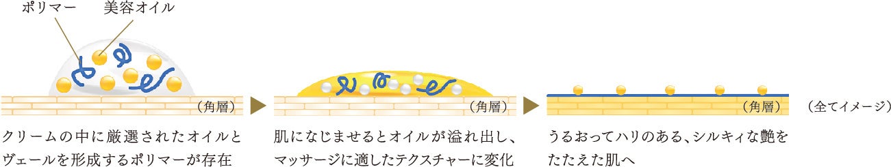 濃厚なクリームのテクスチャーは、肌になじませながら、とろけるようにオイルが溢れ出し、徐々に肌と一体化してヴェールを形成。オイルのレイヤーはするすると摩擦感なく、肌をしっとりと包み込みます。夜眠っている間に、オイルとともにこだわりの保湿成分が角層に浸透。肌表面のヴェールが、ひと晩中うるおいを閉じ込めます。翌朝目覚めると、肌表面のヴェールが光を拡散。優しい膜感に包まれて、角層から輝くような美しい艶を湛えた肌は、なめらかできめ細かく、明るいシルクスキンへ導かれます。