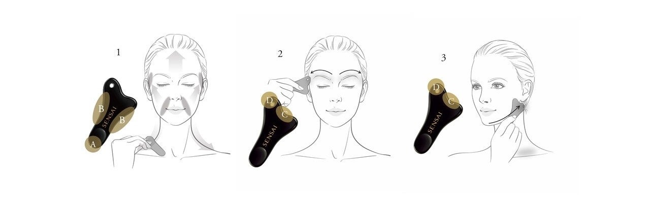 2| Cのくぼみを使い、Dが額側になるように眉頭に置き、眉に沿って眉頭から眉尻、こめかみにかけて数カ所押します。こめかみはDを使って押します。