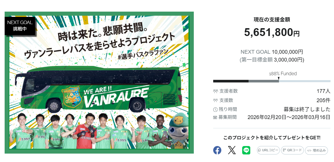 チーム・団体やアスリートを支援するスポーツ専門クラウドファンディングを展開するスポチュニティ株式会社(東京都中央区、以下スポチュニティ)は、ヴァンラーレ八戸のトップチームバスのラッピングを目的としたクラウドファンディングプロジェクトを2月20日から開始し、目標である300万円に対して188%にあたる565万円の支援を集めて、終了しました。