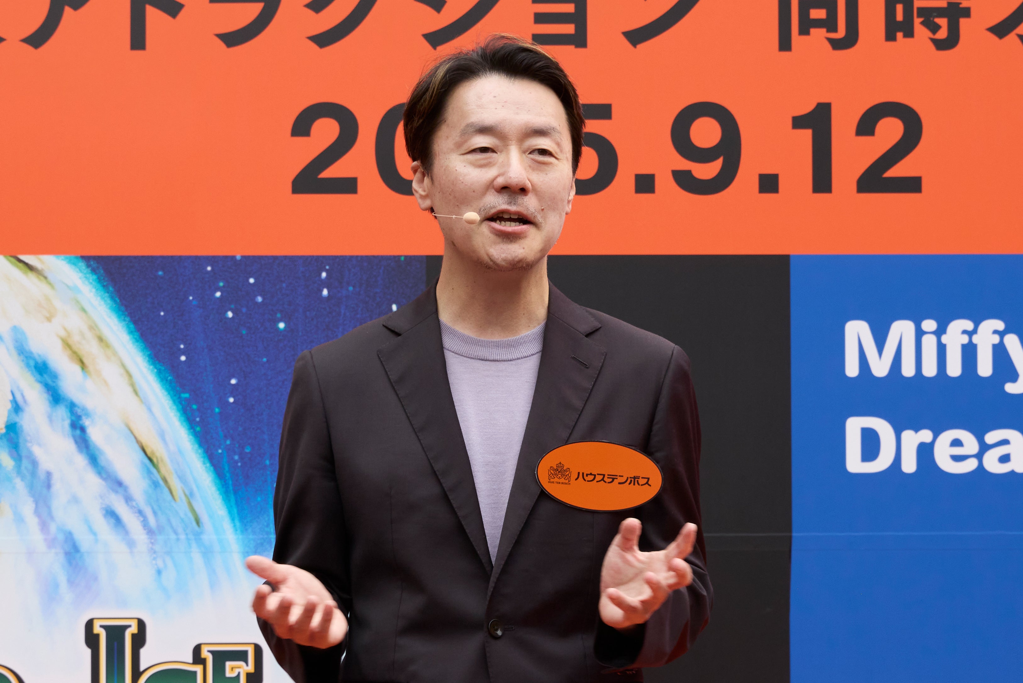 セレモニーに登壇したハウステンボス代表取締役社長執行役員CEO の髙村耕太郎は、「ミッフィーのドリームストーリーブック」は2025年6月21日(土)にオープンした「ミッフィー・ワンダースクエア」を締めくくる最後の重要なパーツであり、「エアクルーズ・ザ・ライド」はハウステンボスの歴史の中でも非常に本格的な体験が出来るライドアトラクションであることを話しました。