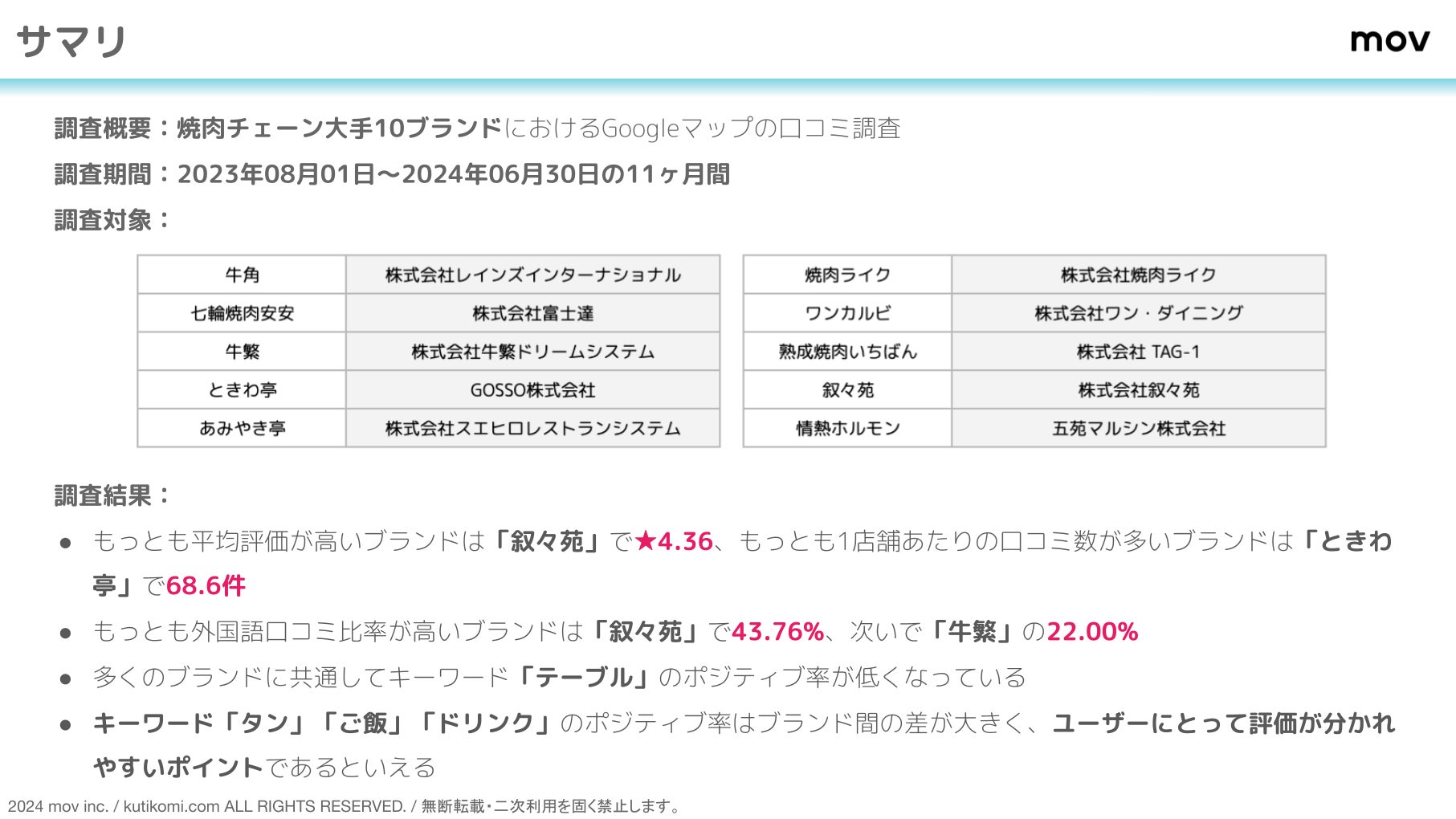 本調査は、以下の大手焼肉チェーン10ブランドに寄せられた44,847件の口コミを対象に行いました。