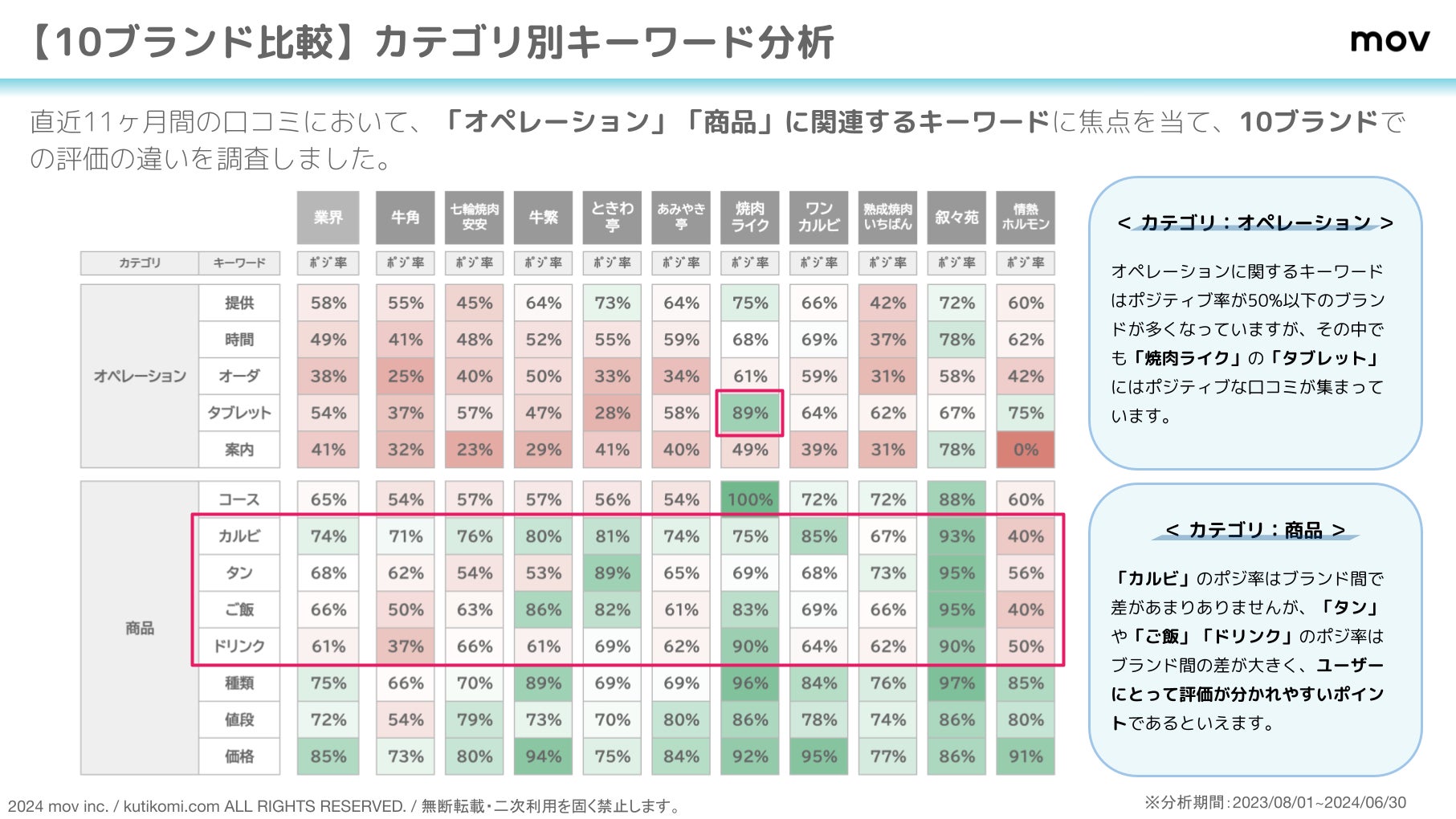 キーワード「カルビ」「価格」は総じてポジティブ率が高い一方、タン」や「ご飯」「ドリンク」のポジティブ率はブランド間の差が大きく、ユーザーにとって評価が分かれやすいポイントであるといえます。