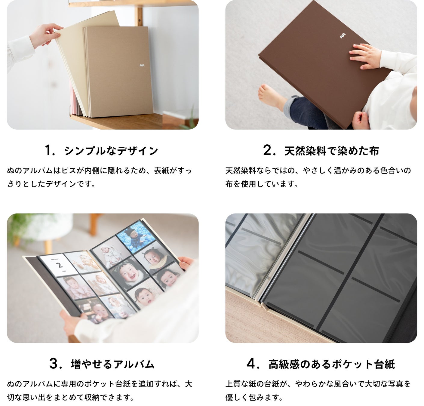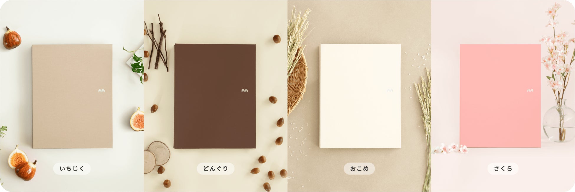 今回、新たに登場する「ぬのアルバム」は、天然染料を使用し、温かみのある自然な色味が特徴です。カラーは「いちじく」「どんぐり」「おこめ」に加え、限定色の「さくら」を含む全4色を展開します。