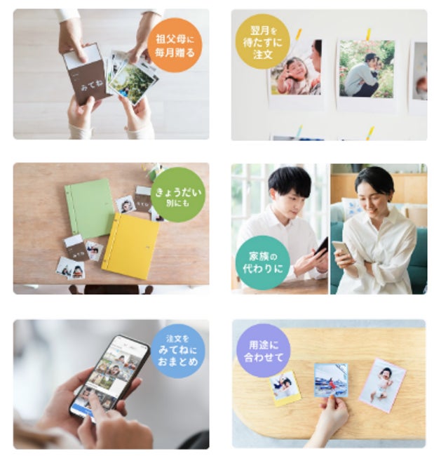 「写真プリント」は、「みてね」内で共有した写真をプリントし、形として残すことができるサービスです。2024年11月より、毎月11枚無料の写真プリントを月3回まで送料のみで注文可能な「おかわりプリント」としてリニューアルを実施し、祖父母へのプレゼントをはじめ、翌月まで待たずにこまめに注文できるほか、きょうだいごとのアルバム作成などにご利用いただけます。