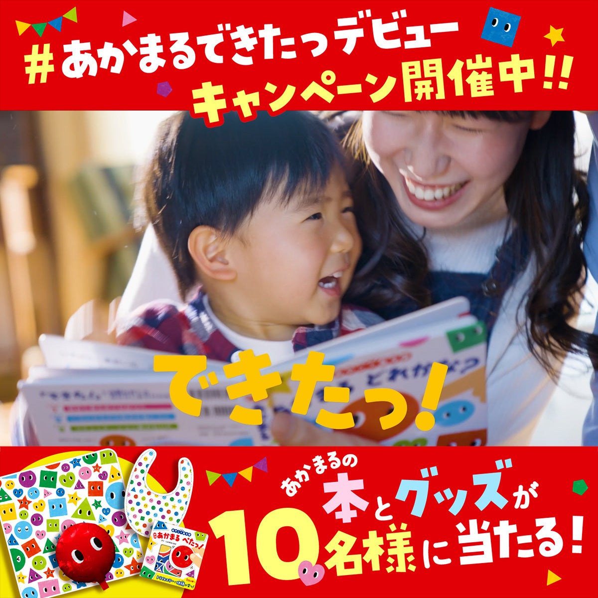 「あかまるフレンズ」シリーズの絵本で遊んでいるお子さんの写真や動画に「#あかまるできたっデビュー」をつけてインスタグラムやツイッターに投稿してくれた方に抽選で合計10名様に「あかまるできたっデビューセット」をプレゼント!