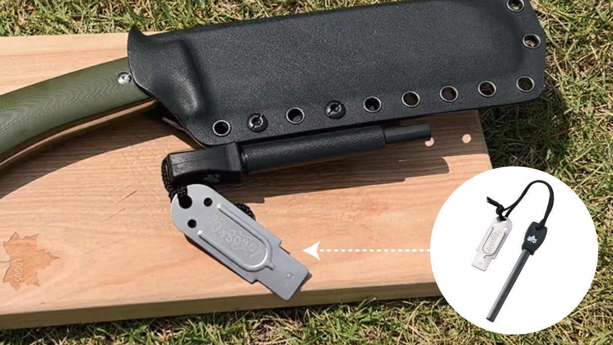 作成したフェザースティックなどに着火できる「ファイヤーストライカーセット」(別売り)を収納できるホルダー付き。今回のクラウドファンディングでは、ファイヤーストライカーセットも一緒にお買い求めいただける特別セットもご用意。