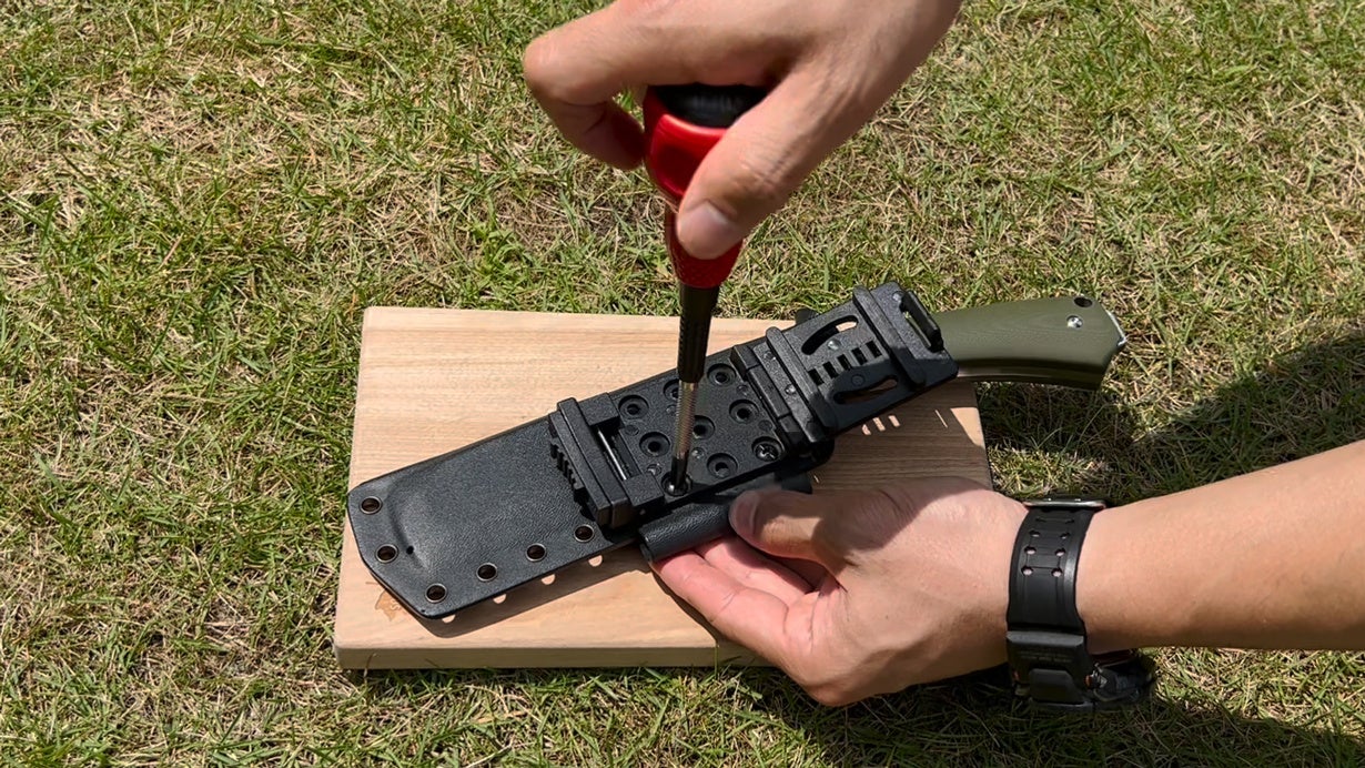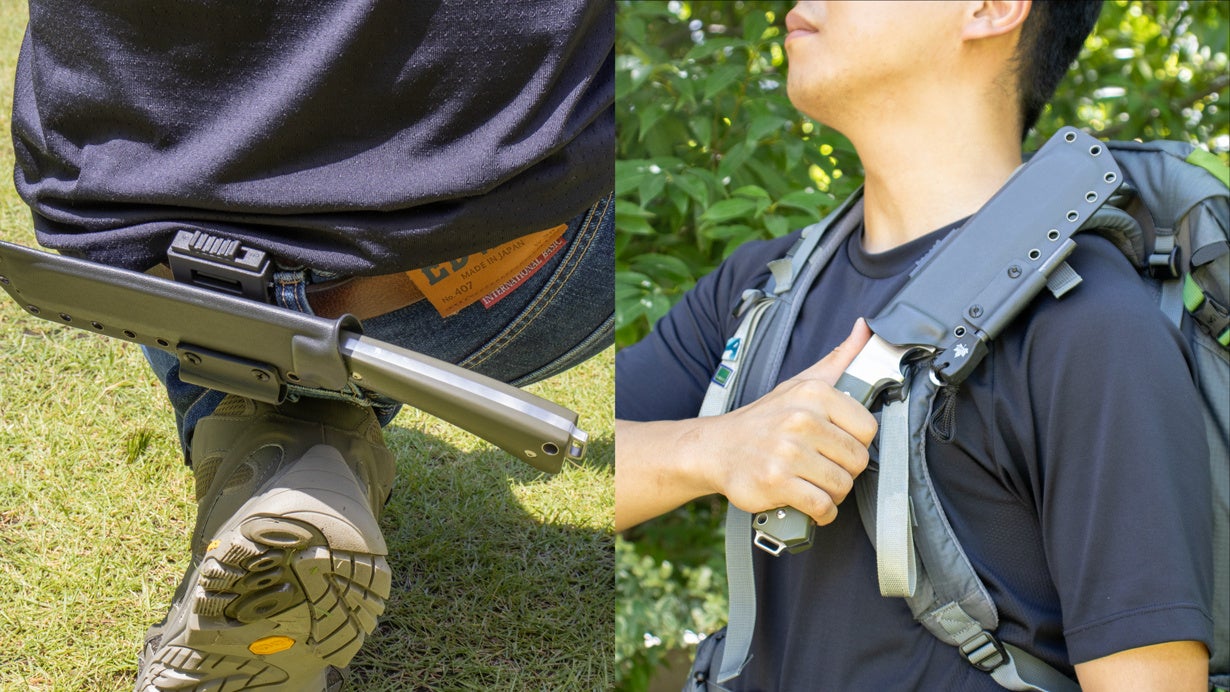 鞘(シース)には、軽くて丈夫なうえメンテナンスがほとんど不要なカイデックス素材を使用。ハンドルを握って親指で押せばロック解除できるようになっており、ナタを確実にホールドしつつ片手で簡単に抜き差しできる構造。カチッとロックするまで差し込めば、振り回しても外れない。