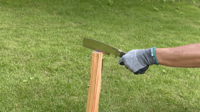 ブレードを構成する1枚の金属の板がナイフの先端から後端まで通った「フルタング構造」を採用しているため強い衝撃を与えても破損しにくいほか、5.5mm厚のブレード&500gの重量のコンビネーションが生み出すパワーで豪快なバトニングを楽しめます。鋼材はサビに強く、研ぎやすく、コストパフォーマンスに優れたバランスの良いステンレス440を使用しており、耐摩耗性や疲労強度に優れます。さらにブレードの左右に刃がついた両刃構造になっており、利き手を選ばず薪をまっすぐ割ることが可能です。また、安全性を重視し、ブレードの先端が尖っていない「角ナタ」の形状を採用しました。