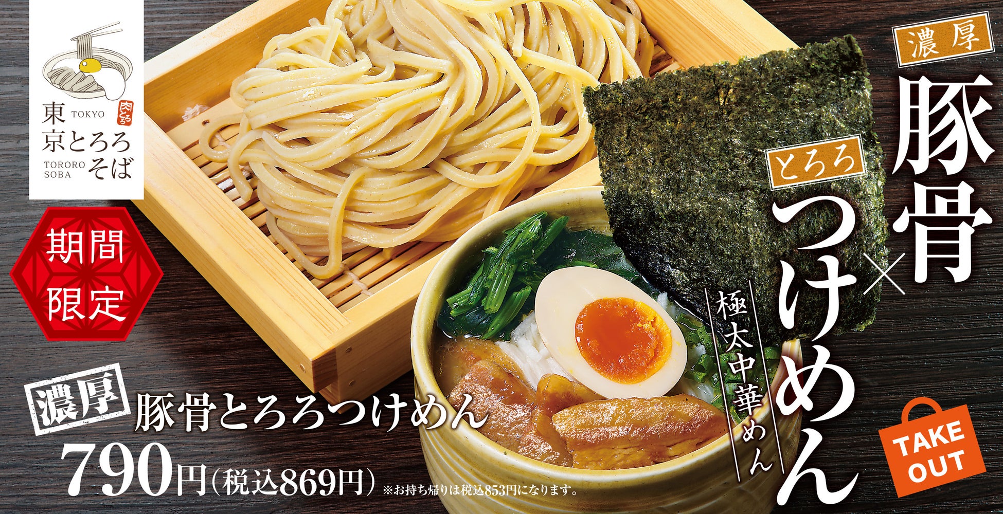 期間限定メニューの「濃厚豚骨とろろつけめん」は、店内飲⾷はもちろん、お持ち帰りやUber Eatsなどご利⽤いただけます。