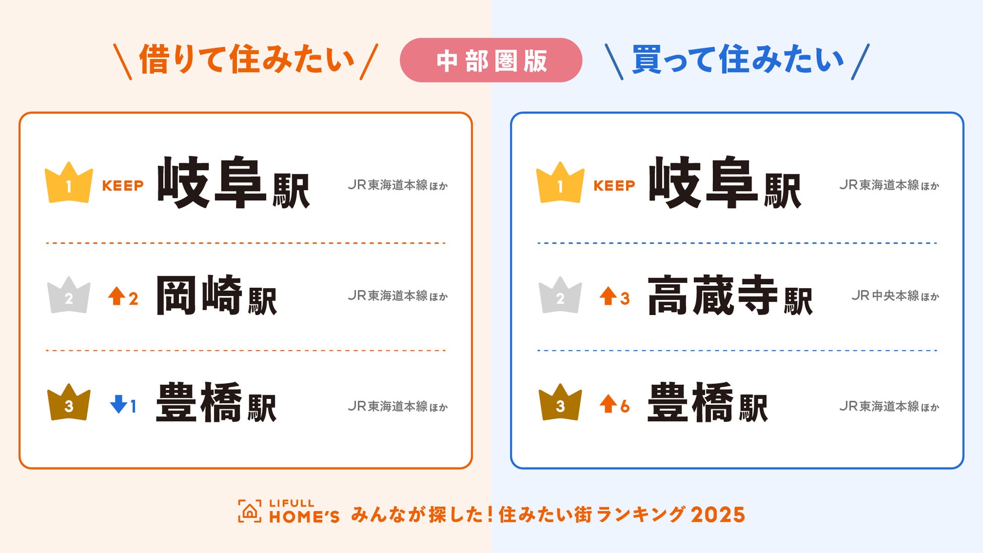 賃貸物件への問合せ数を集計した「2025年LIFULL HOME'Sみんなが探した!借りて住みたい街ランキング(中部圏版)」は、圧倒的な強さでJR東海道本線「岐阜」が7年連続の1位となりました。2位「岡崎」、3位「豊橋」の約1.5倍の問合せ数を獲得し、名古屋市の“衛星都市”3強が上位を独占しています。