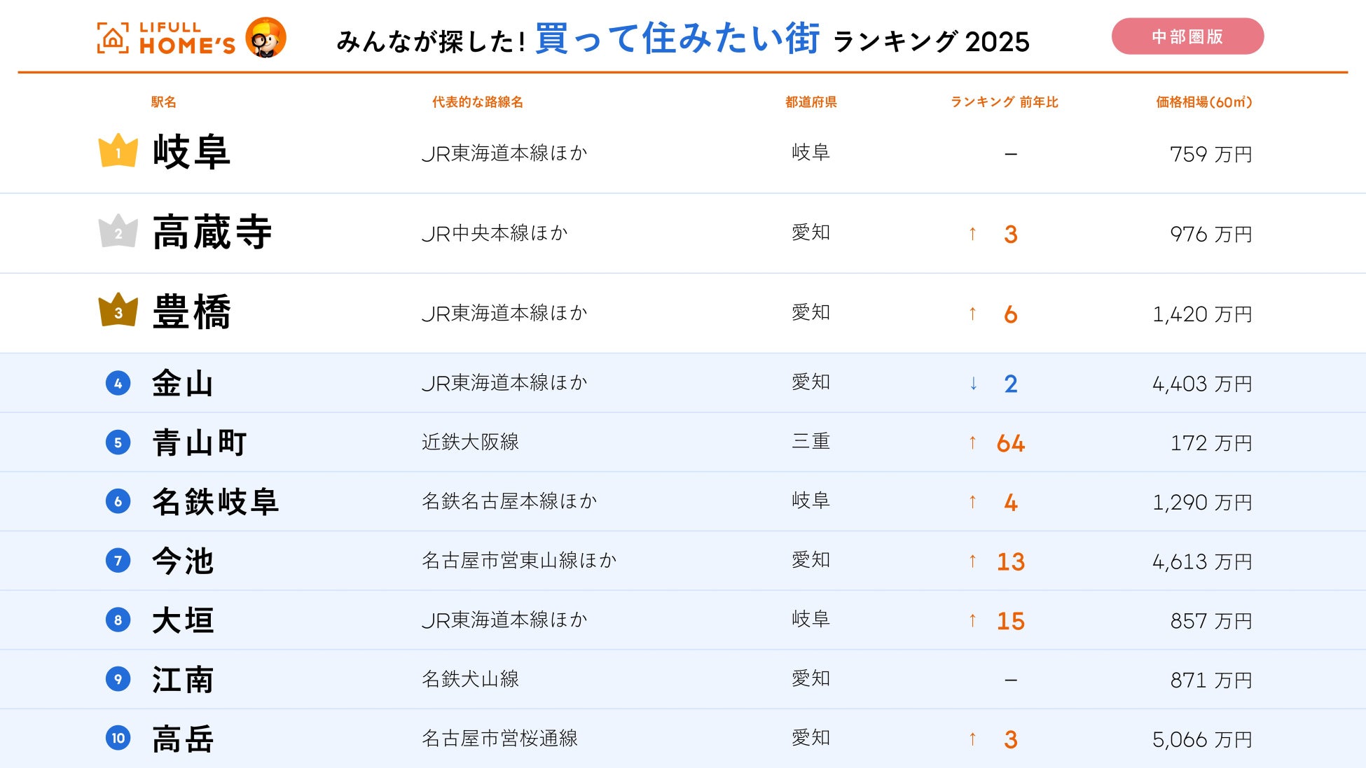 株式会社LIFULL(本社:東京都千代田区、代表取締役社長伊東祐司、東証プライム:2120)が運営する不動産・住宅情報サービス「LIFULL HOME'S(ライフルホームズ)」は、「2025年 LIFULL HOME'S みんなが探した!住みたい街ランキング(中部圏版)」を発表しました。