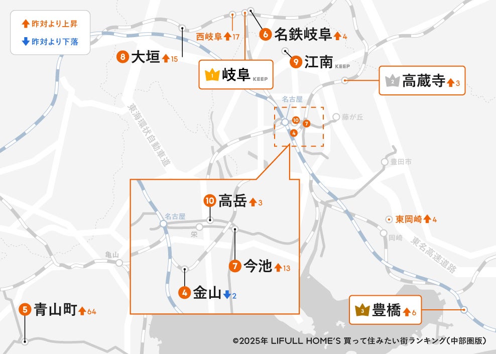 購入物件への問合せ数を集計した「2025年LIFULL HOME'Sみんなが探した!買って住みたい街ランキング(中部圏版)」は、「岐阜」が2年連続1位を獲得しました。借りて住みたい街でも7年連続1位となり、“買って”と“借りて”の2冠達成も2年連続の快挙です。また、「岐阜」から徒歩圏の「名鉄岐阜」も前回10位から6位に上昇し、両駅はほぼ同一エリアとして見ると、岐阜人気が極めて高いことがわかります。2位はJR中央本線と愛知環状鉄道が乗り入れる「高蔵寺」で前回5位から上昇しました。名古屋市郊外の春日井市に位置し、やはり物件価格の高騰から購入ニーズが名古屋市中心部から郊外方面へと拡散している状況がうかがえます。3位は「豊橋」、名古屋市内では4位の「金山」が最高位でした。