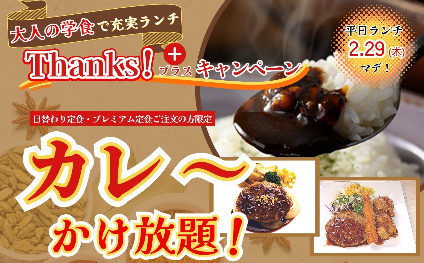 ・日替わり定食・プレミアム日替わり定食をご注文されたお客様対象にてカレーかけ放題!
