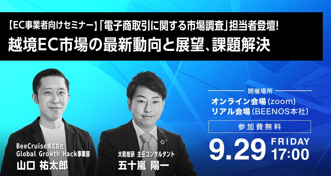 本セミナーでは、クライアント様からの越境EC導入の意向に応えたいEC事業者様の課題解決に資するため、経済産業省の「電子商取引に関する市場調査」を担当する大和総研 主任コンサルタントの五十嵐陽一氏を講師に迎え、越境EC市場の最新動向や展望、訪日動向との関連や今後の注目市場について徹底解説するとともに、BeeCruiseが越境EC導入の基礎や運用課題、その解決方法についても解説いたします。