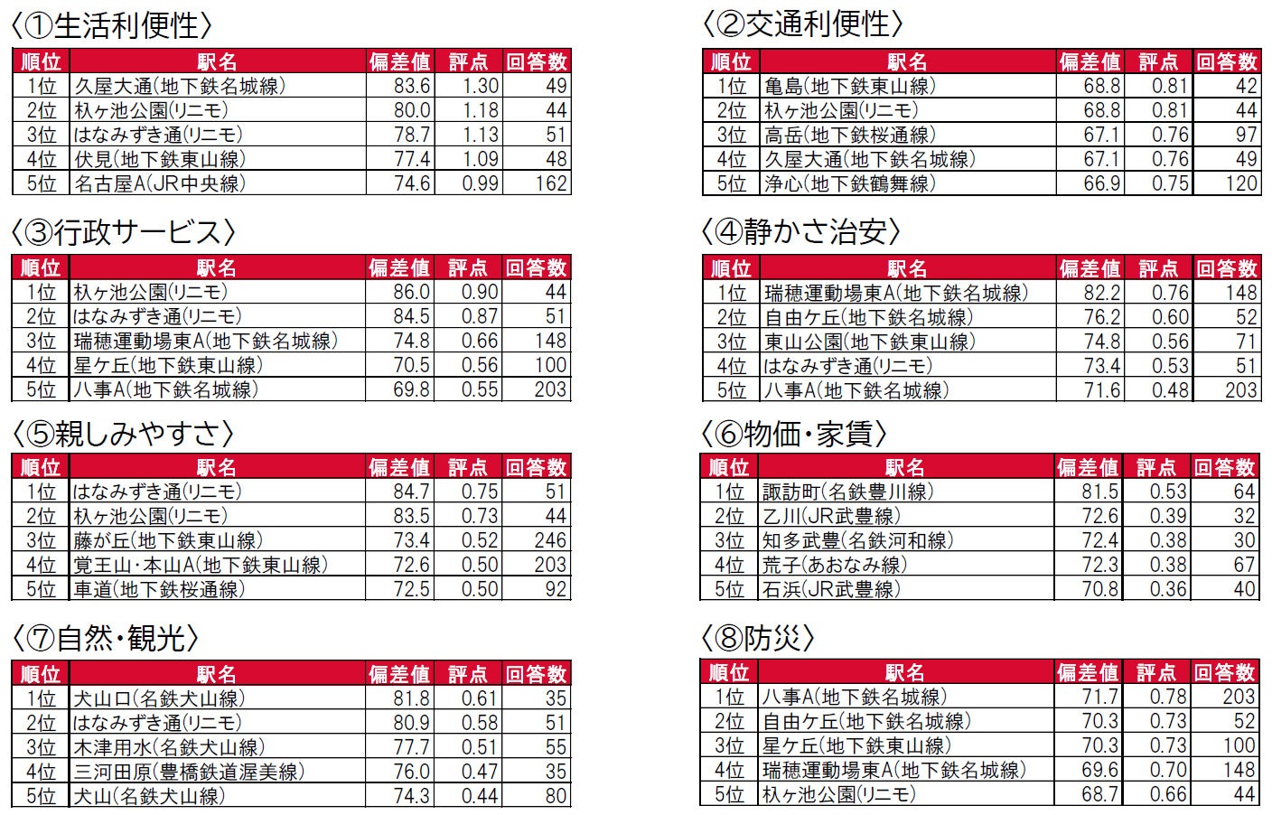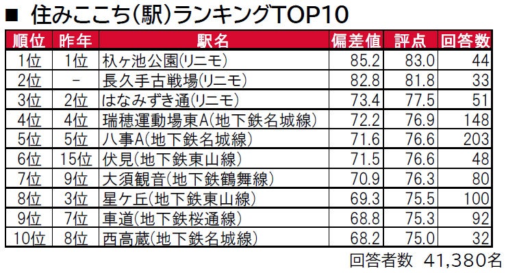 1位は2年連続で、名古屋市と豊田市への交通の利便性が良く、駅前に商業施設が充実している杁ヶ池公園で、偏差値80台の高い評価を得ています。昨年は回答者数が30名に満たなかったため集計対象外だった長久手古戦場も、偏差値80台の高い評価で2位、閑静な住宅街が広がるはなみずき通が今年は3位です。なお、TOP3の駅は、すべて長久手市にあるリニモ沿線の駅です。