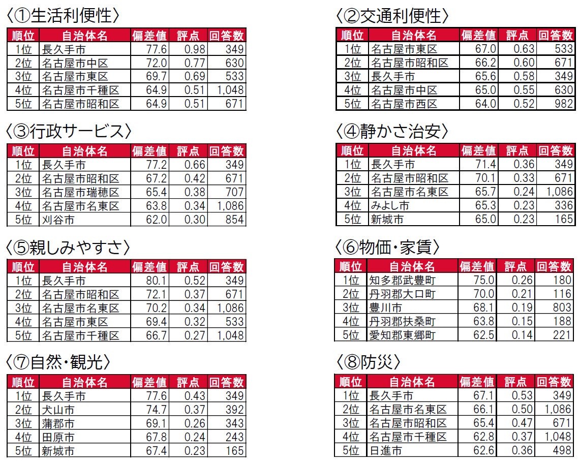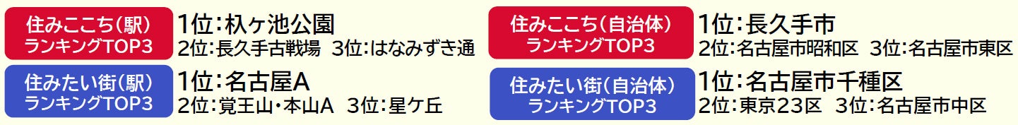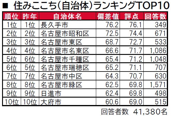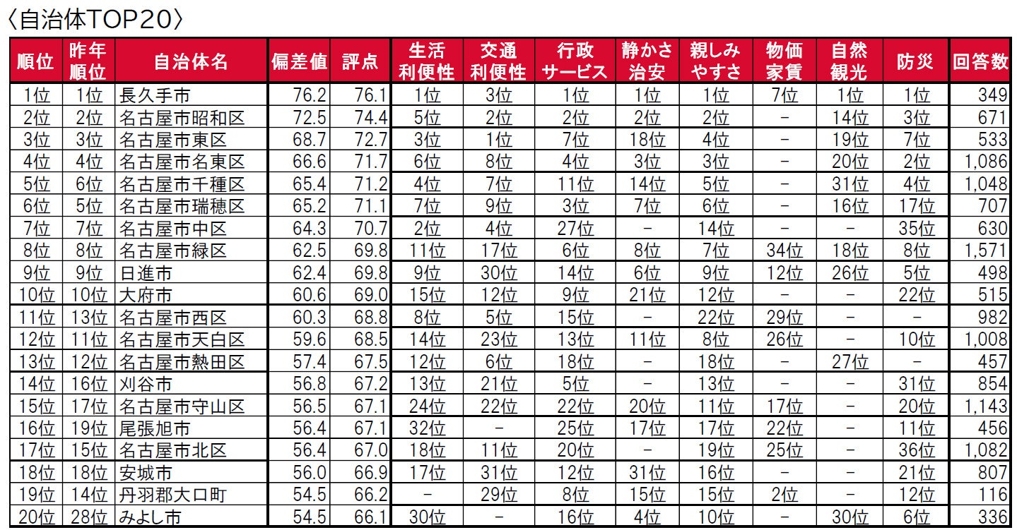 住宅地や商業施設が多く立ち並び、豊かな自然も多いベッドタウンの長久手市が3年連続で1位です。また、2位の名古屋市昭和区、3位の名古屋市東区も3年連続で同じ順位となっています。