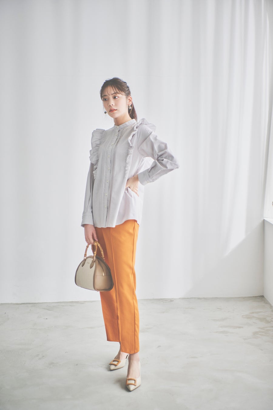 そのほかフェミニンスタイルに映えるフリルデザインが特徴的なブラウスやとろみ素材のボリュームスリーブブラウス、コラボでは初登場のシルエットを追求したセンターシームパンツをラインアップいたしました。
