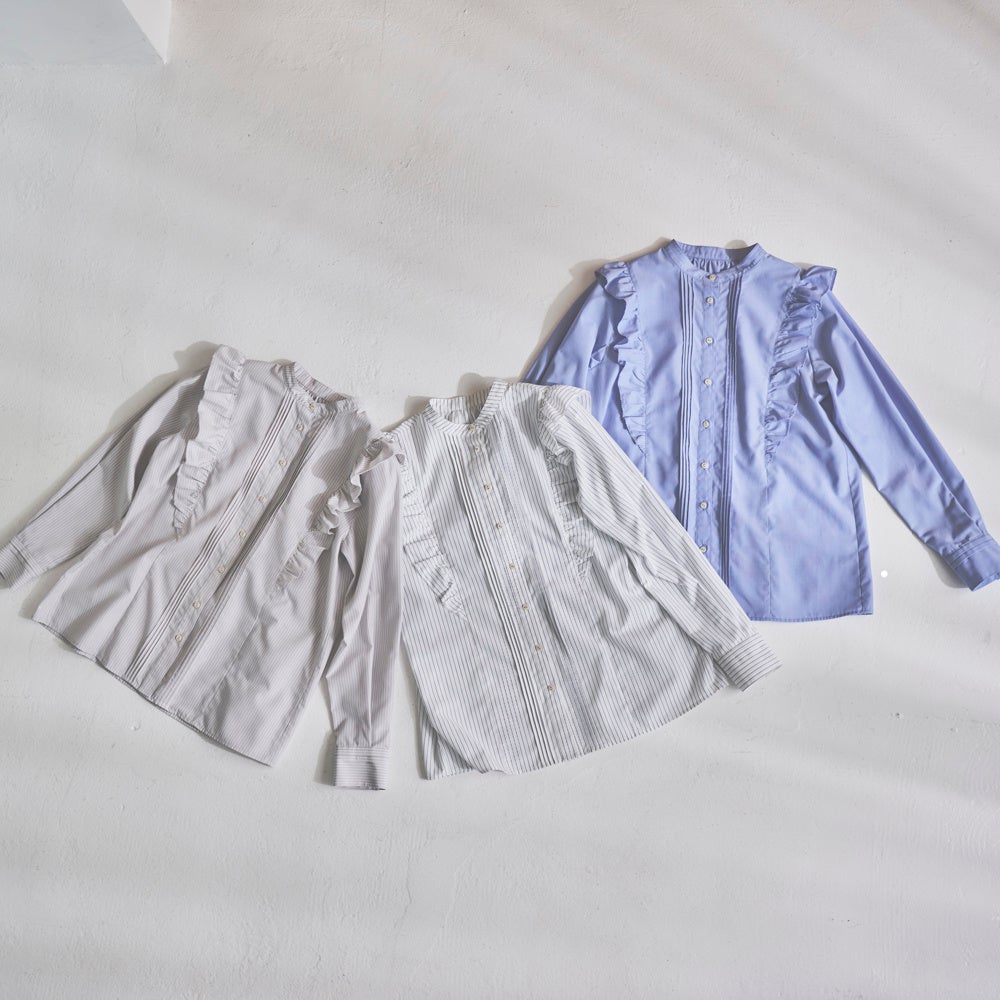 首元はシンプルなスタンドカラーに。ストンとした袖やシャープなピンタックが、すっきりとした印象を与えてくれます。洗練されたフリルの配置でスタイルアップ効果も!爽やかで春らしいブルーに、大好きなストライプ柄はそれぞれ印象の違う2パターンをつくりました。
