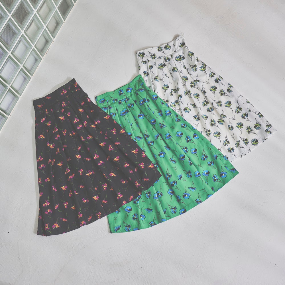 中でも一押しは、春定番の花柄を存在感たっぷりにプリントしたスカートです。トロピカルなグリーンにクラシカルなブラック、取り入れやすいホワイトの3色をセレクトし、コーディネートの主役になる1着に仕上げました。太めのハイウエストに、全身をすっきり見せるフレアシルエットでスタイルアップできるデザインにもこだわりました。