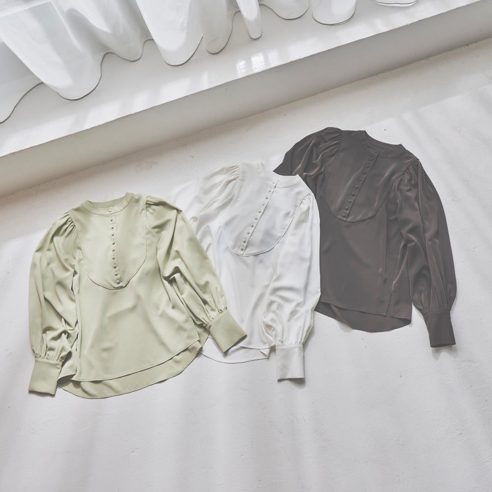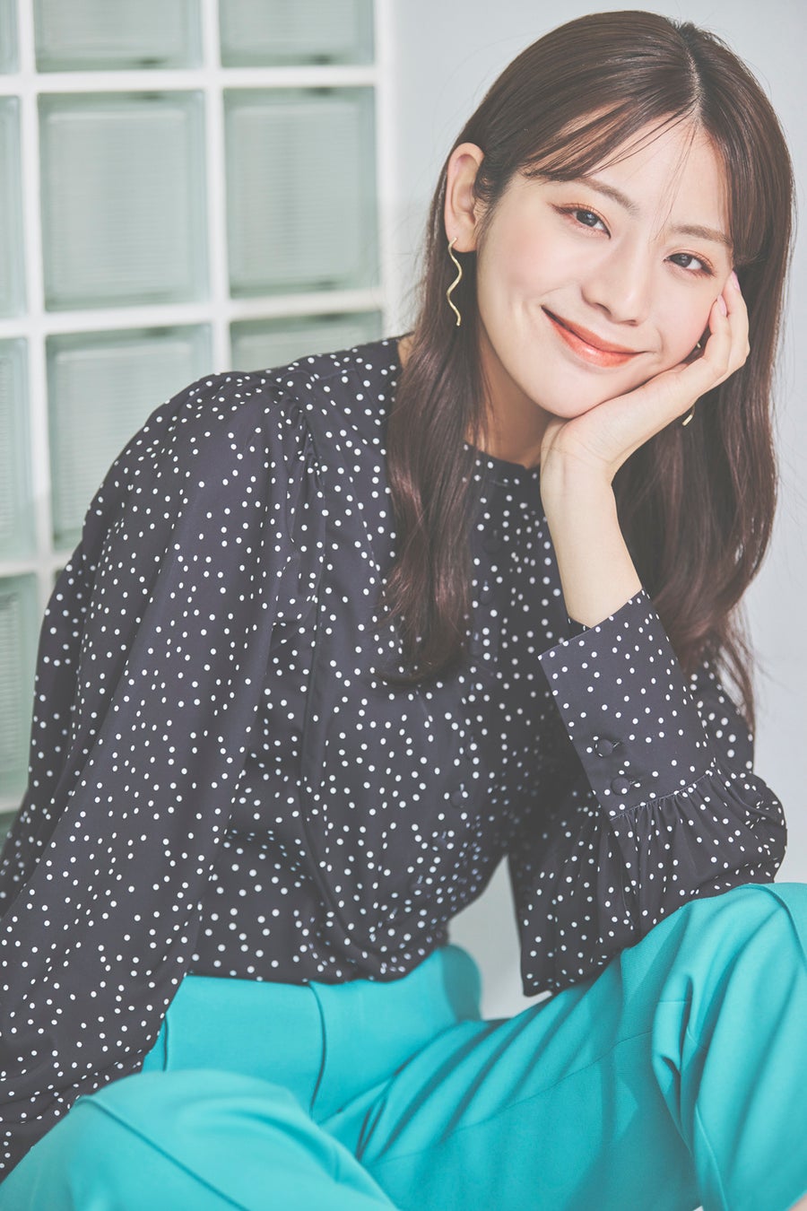 私が大好きなボリュームスリーブを、今季は春らしいブラウスで取り入れました!とろみのある素材なので、動きによっていろんな表情を見せてくれます。袖口の幅は広めにし、腕が長く見えるようにしたのもこだわりです。カラーはどんなボトムにも合わせやすく、顔色がきれいに見えるものをセレクト。胸元の切り替えデザインや、コロンとしたくるみボタンも新鮮で可愛いですよね!