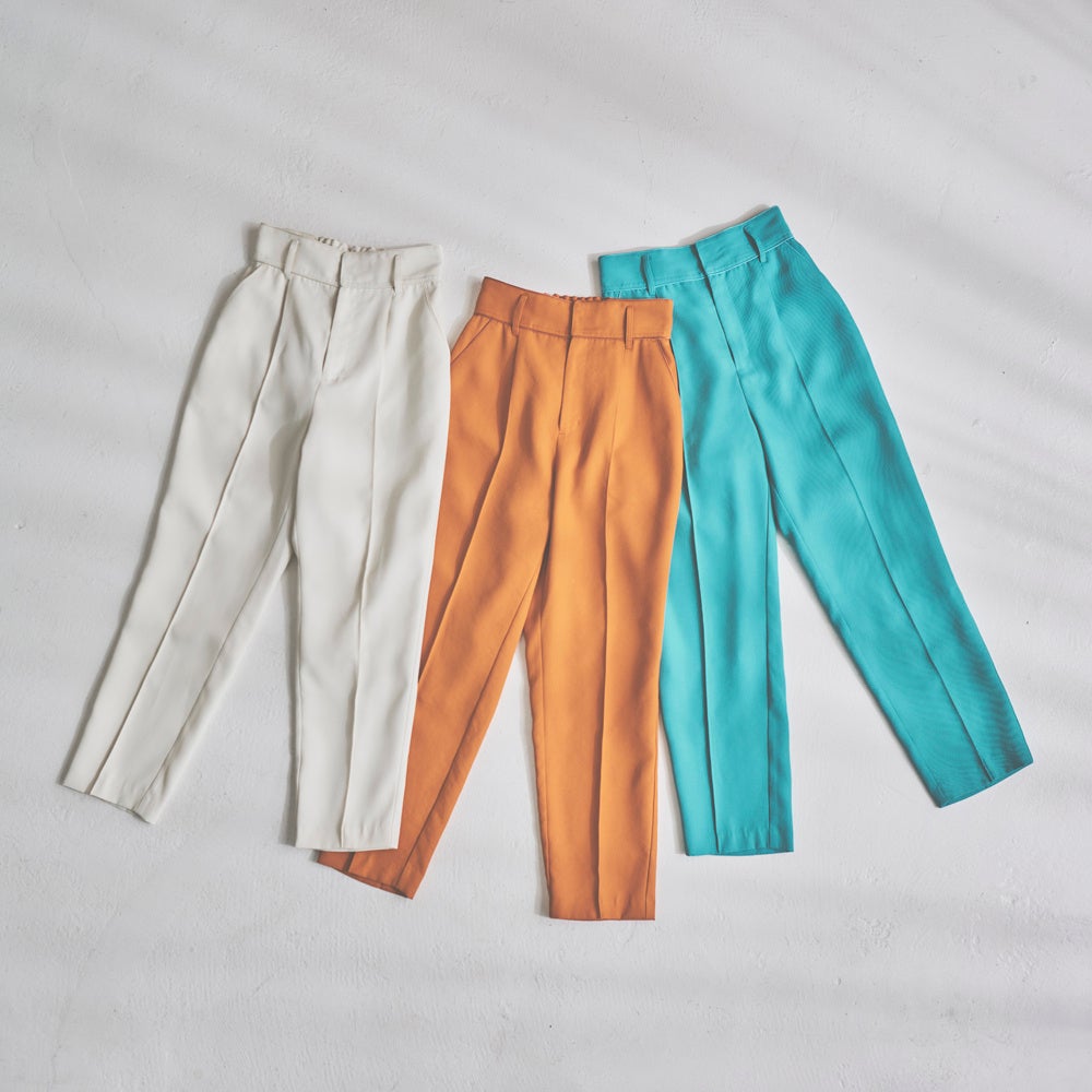 パンツは単品では初のコラボレーションなので、完成を一番楽しみにしていました!存在感のあるパッキとしたカラーに、同色でさりげなく入れたウエストのパイピングが本当に可愛くて大満足です。色がカジュアルなぶん、タック入りのデザインでシルエットはきれいめに。立体感のあるセンターラインが抜群の脚長効果を発揮してくれるので、どんな身長の方でも着こなしやすいはず!