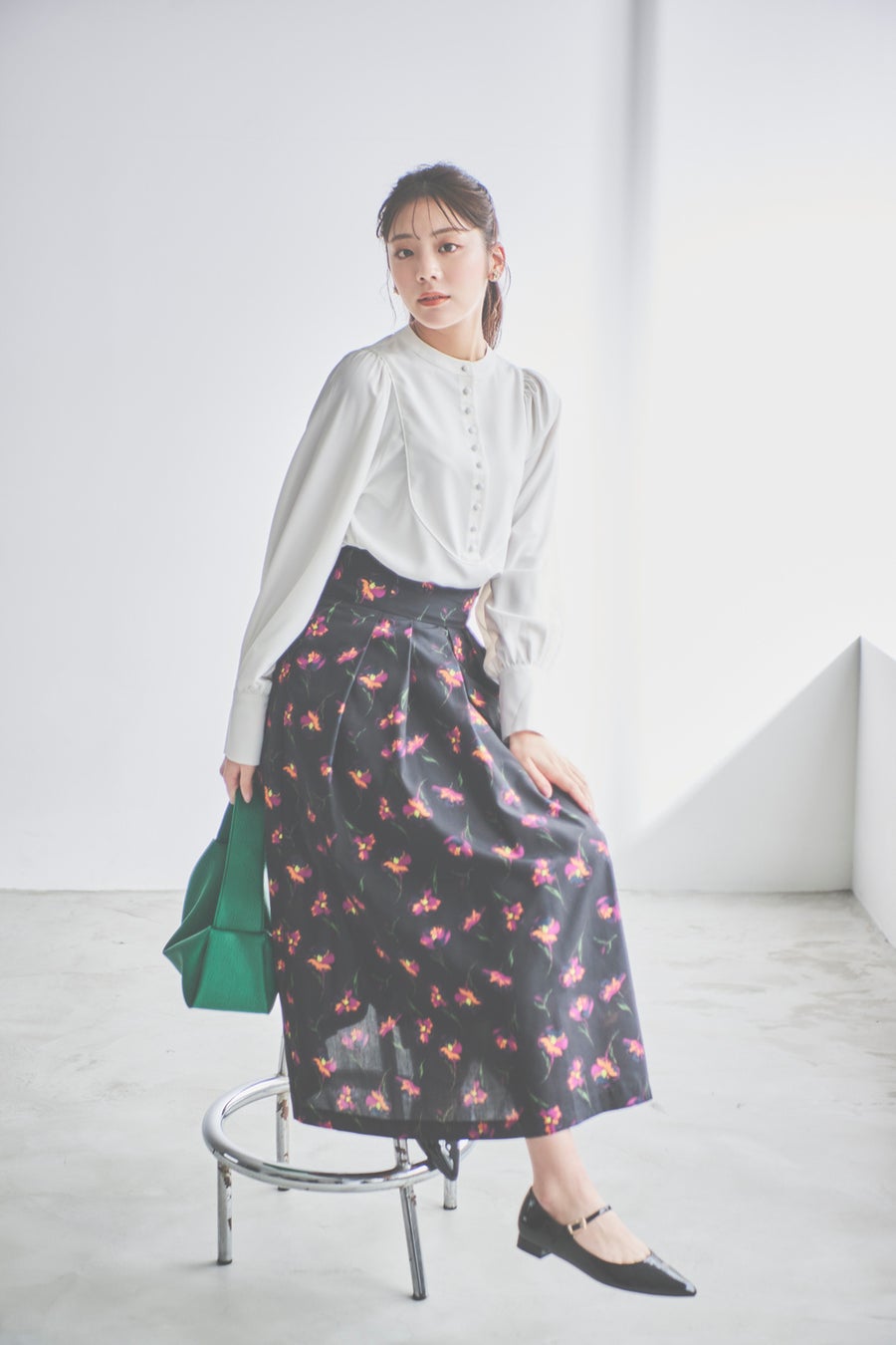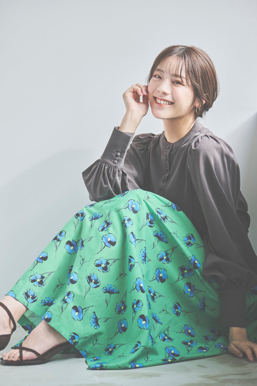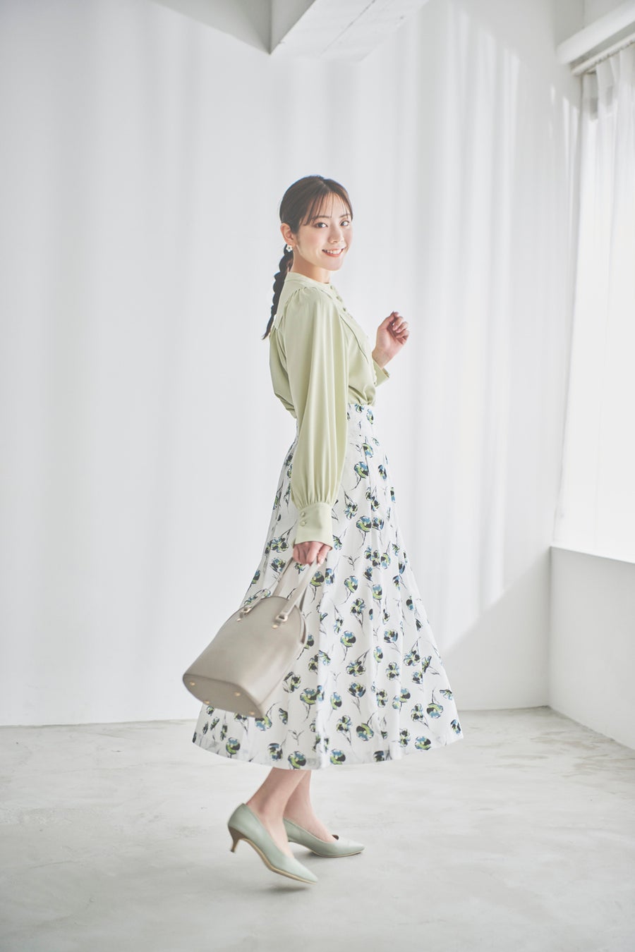 春の定番アイテム・花柄スカートは、あえてビビットなカラーで仕上げ、コーディネートの主役になる1着に。初夏を感じるトロピカルなグリーンに、クラシカルなブラック、取り入れやすいホワイトの3色をセレクトしました。色が印象的なので、花柄は派手な雰囲気になりすぎないよう適度な大きさにしています。大人っぽくスタイルアップできる、Aラインのシルエットもお気に入りです!