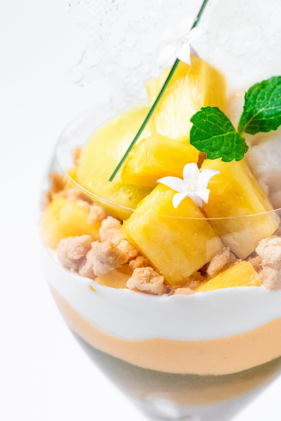 アルマーニ / カフェ 表参道の人気メニュー、月替わりのパフェ。6月は、みずみずしいパイナップルとライチの果実味に、タラゴンやカルダモンが香り立つ「パイナップル ライチ カルダモンのパフェ」をご用意いたしました。