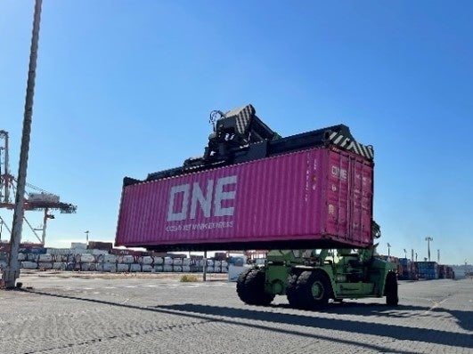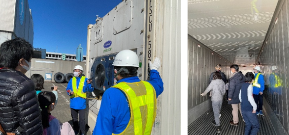 最後はONEのコンテナに潜入。リーファーコンテナ・ドライコンテナの違いを学び、コンテナをリーチスタッカーで運ぶ様子を見学、両コンテナに入り違いを確認しました。