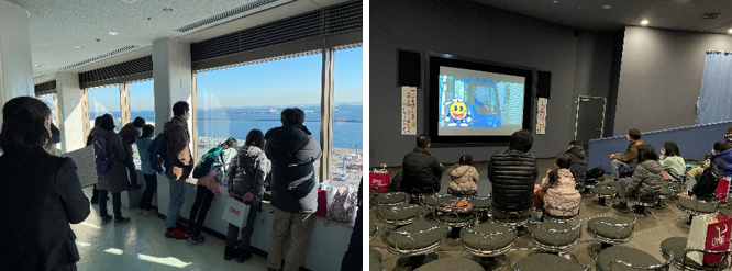 川崎マリエンでは360度見渡せる展望室から海・川崎港を一望、身をのりだして見ていました。望遠鏡からは船の様子がよくみえ、大人気でした。今度は夕焼けの富士山や夜景も見てみたいねという声も頂きました。