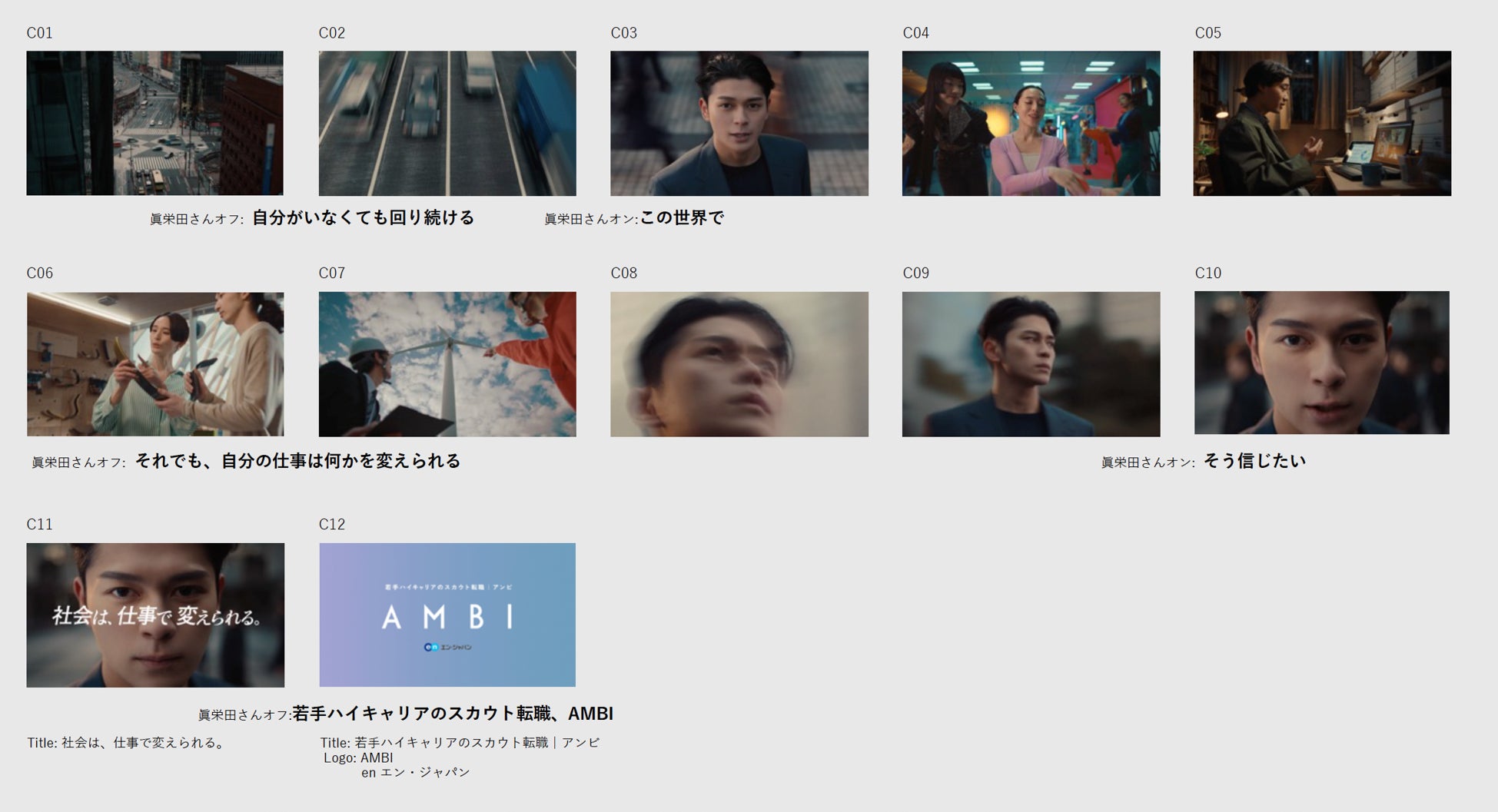 高いポテンシャルと挑戦心を併せ持つ若手ハイキャリアという、AMBIのユーザーイメージを象徴する存在として、眞栄田 郷敦(まえだ ごうどん)さんをブランドキャラクターに起用。「社会は、仕事で変えられる」という、困難な時代の中で未来を切り開いていく希望となりうるメッセージを、力強く表現していただきました。自分がいなくても回り続けていく世界で、それでも、自分の仕事は何かを変えられる──そんな想いを持って仕事に打ち込む若手ハイキャリアの姿を描き、志ある若手の背中を押すCMとなっています。