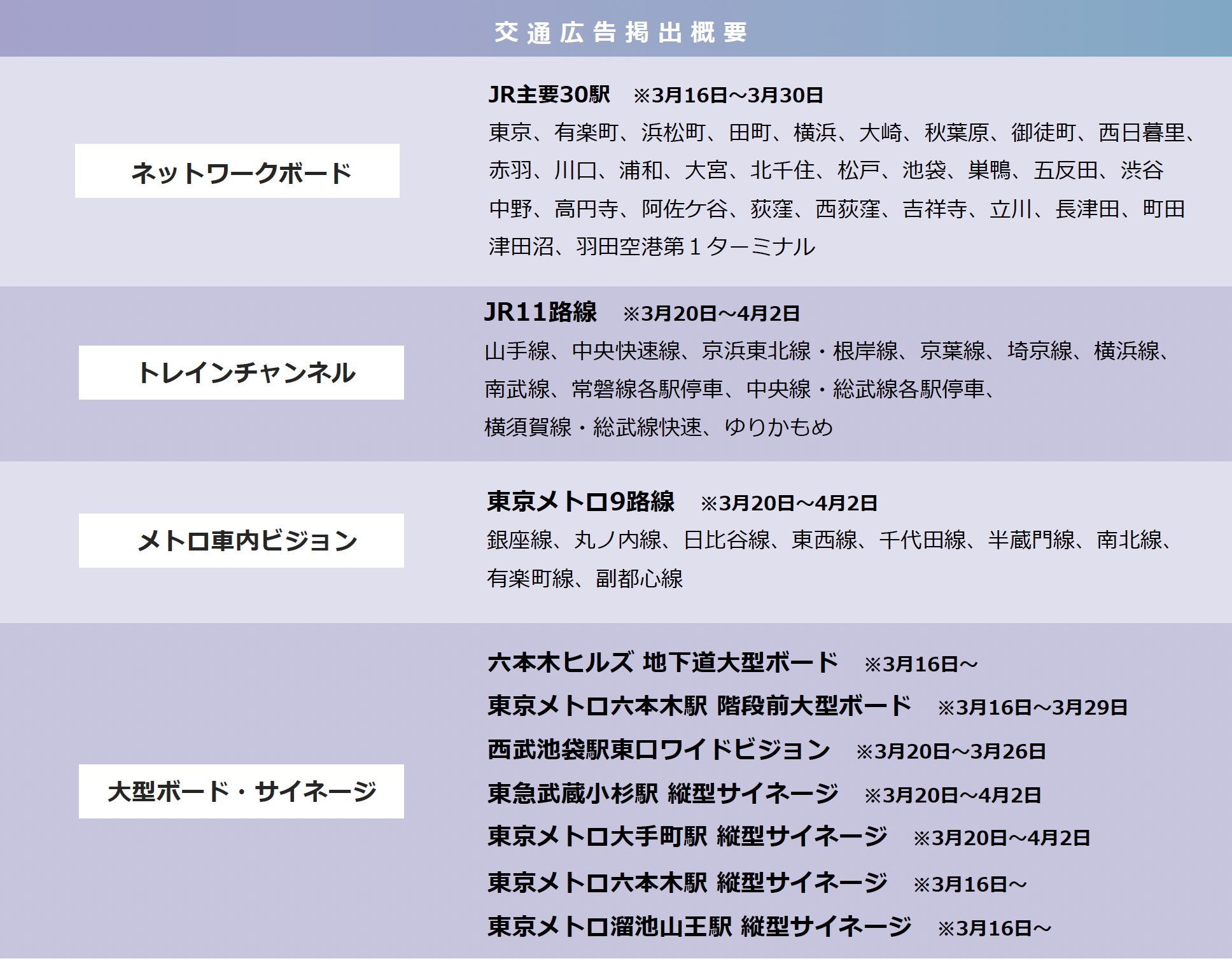 JR主要駅や東京メトロ六本木駅、大手町駅を中心に、30駅以上で交通広告を展開。その他、JR・東京メトロの車内ビジョン(トレインチャンネル等/計20路線)でもCM映像を放映いたします。