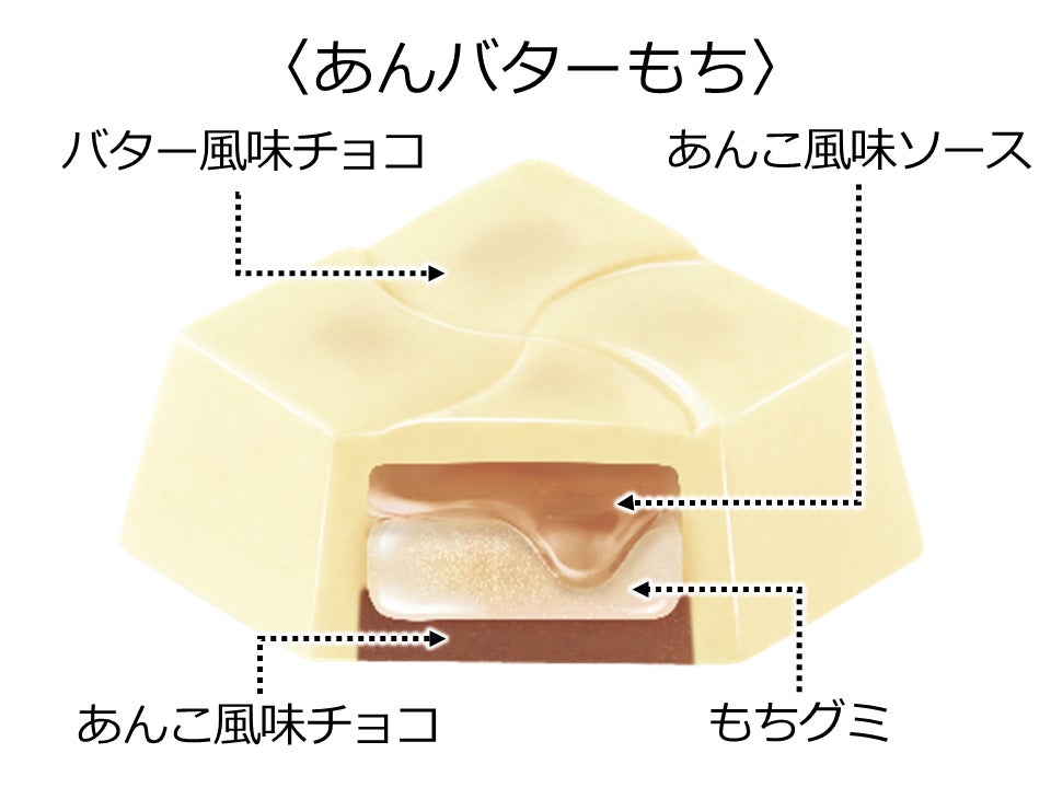 あんこ風味ソースともちグミをバター風味チョコで包みました。