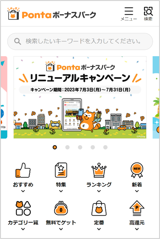 ボーナスパークを初めて利用する方におすすめのサービス・商品の特集や、Pontaポイントプレゼントなどのキャンペーンを掲載するコーナーを追加し、ユーザーの皆様がさらにおトクに利用できるよう、情報を発信いたします。