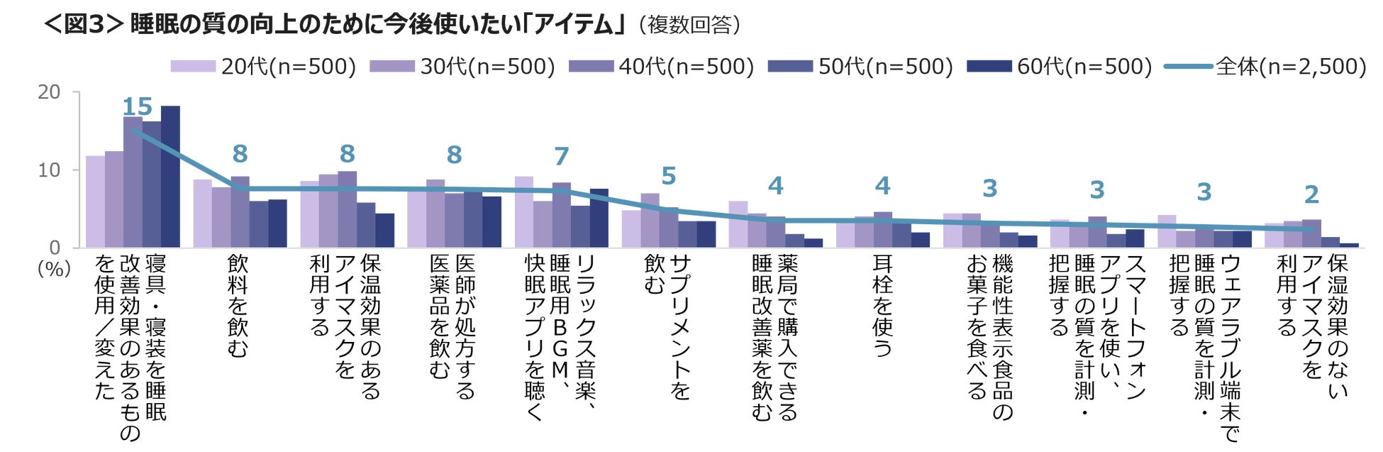 睡眠の質の向上のために「寝具・寝装は睡眠改善効果のあるものを使用/変えた」は15%、40~60代が高い。次いで「飲料を飲む」「保湿効果のあるアイマスク」「医師が処方する医薬品を飲む」が8%と続く。<図3>