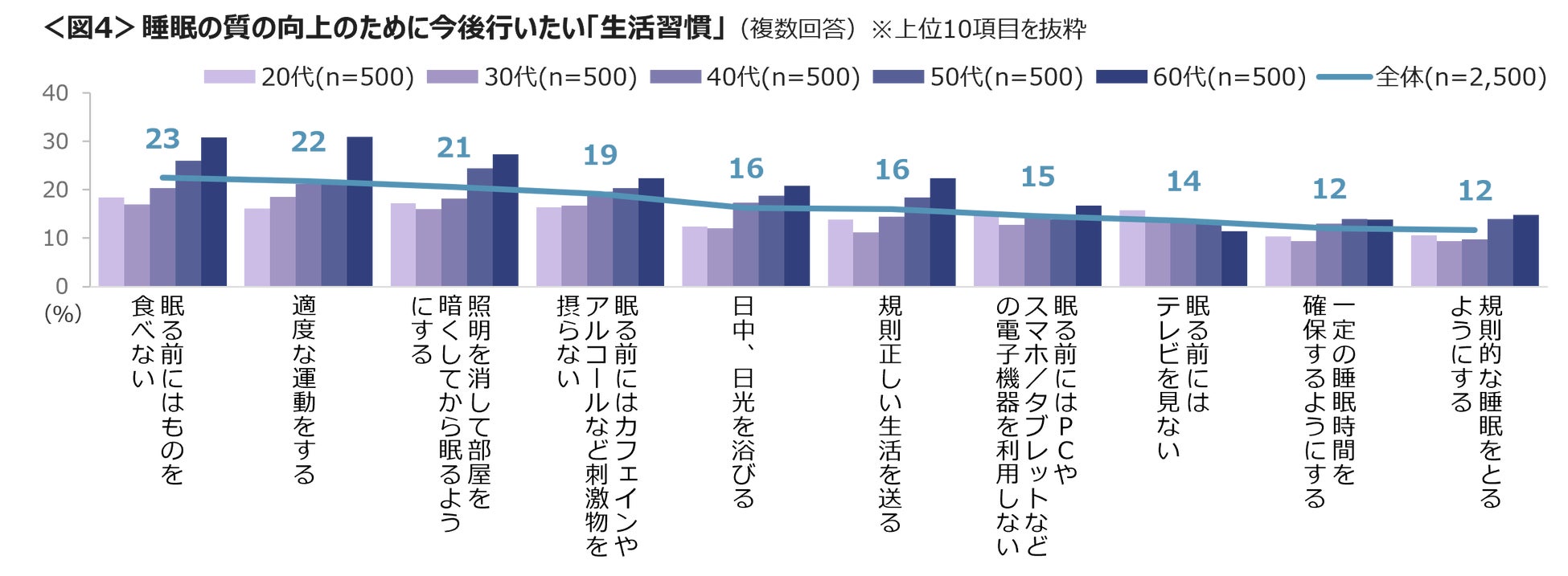 今後行いたい生活習慣は「寝る前にはものを食べない」「適度な運動をする」「照明を消して部屋を暗くしてから眠る」が2割台。<図4>