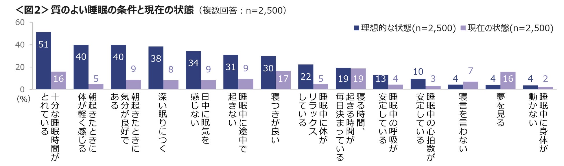 質のよい睡眠の条件は「十分な睡眠時間がとれている」が51%、「朝起きた時に体が軽く感じる」「朝起きた時に気分が良好である」が4割台。「深い眠りにつく」も加えた理想として上位にあがる睡眠状態と自身の現状とでの差は30pt以上と乖離している。<図2>