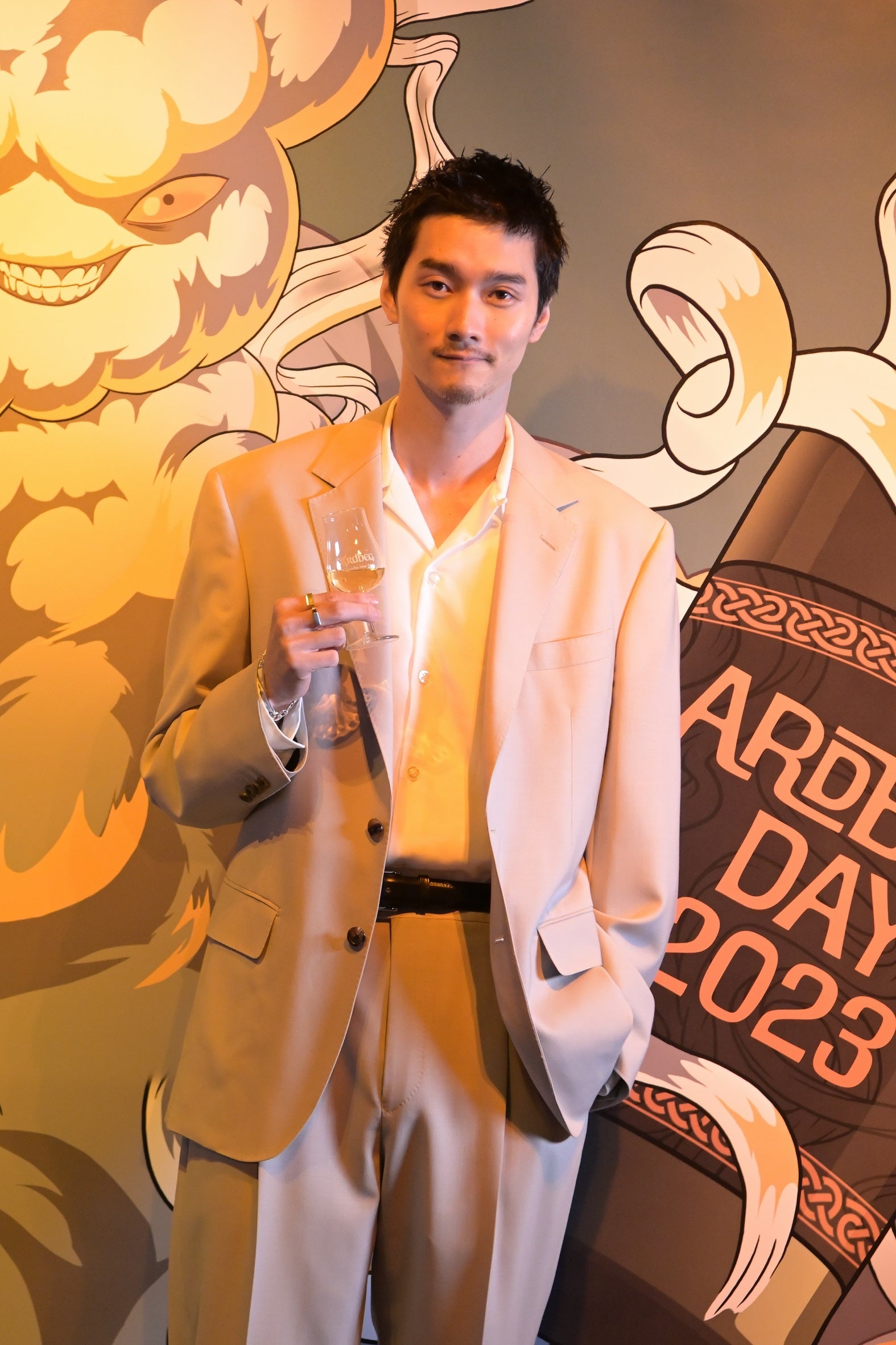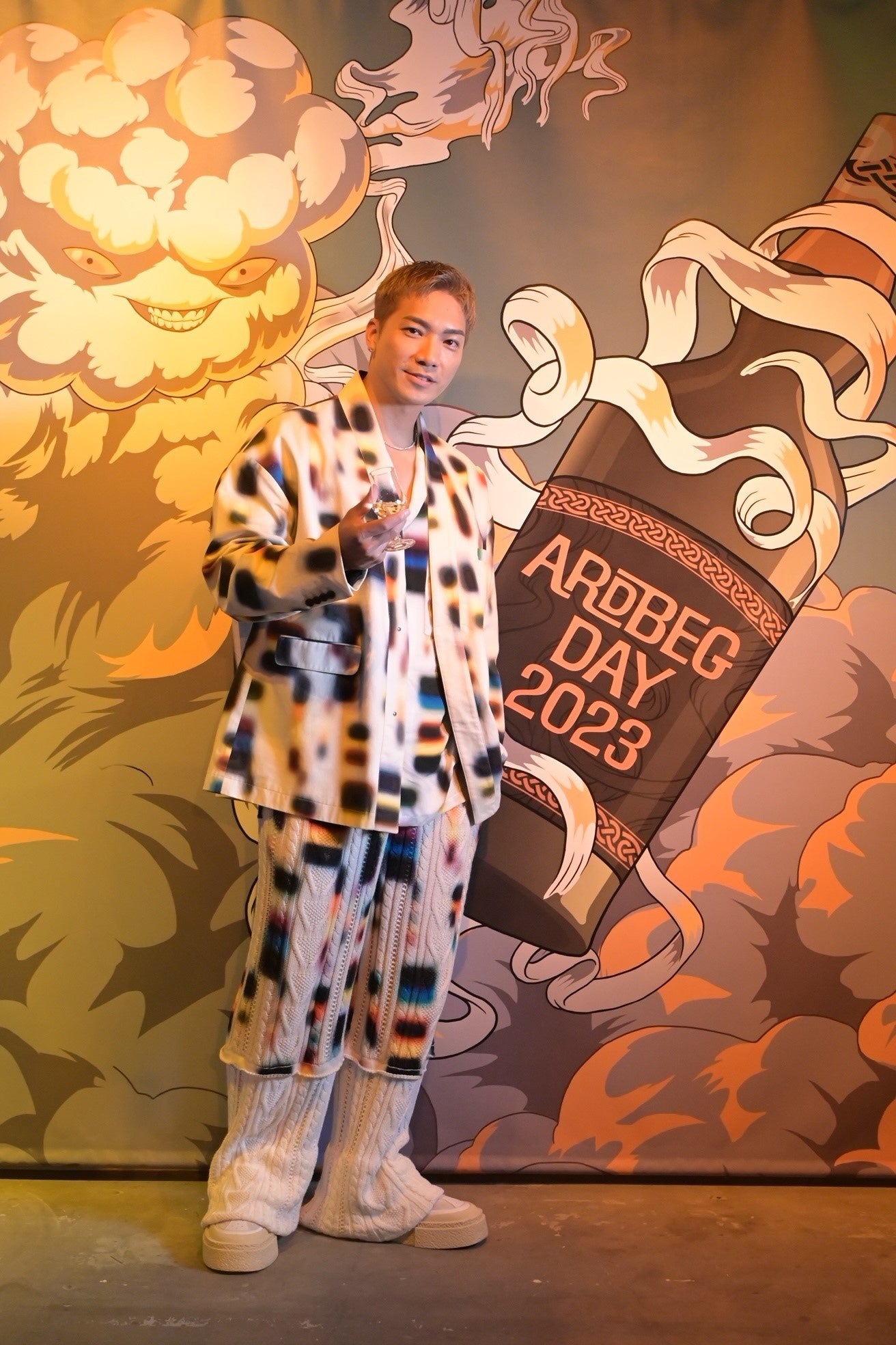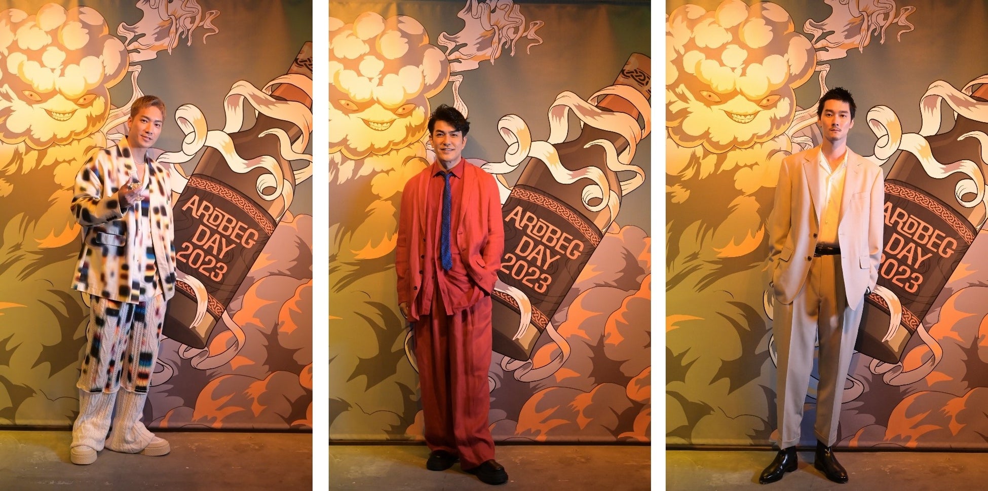 オープニングイベントでは、多くのセレブリティーもアードベッグ・デーのお祝いに駆け付けました。鮮やかな赤のセットアップで登場した北村一輝さんは、「自宅には常にアードベッグが置いてあり、気分によって飲み方を変えています。お気に入りの飲み方は、ソーダとアイスを入れたグラスに上からアードベッグを垂らして混ぜないで飲む割り方です。そうすることでアードベッグの味がよりわかりやすく、口の中で味わいが広がるような気がします。」と、自身のアードベッグの楽しみ方を語りました。また、柳俊太郎さんも、自宅には常にアードベッグのボトルを置いていると話し、「アードベッグは上品なお酒のイメージなので、家ではロックでチビチビと、香りを楽しみながら味わっています。アードベッグ 10年は特に鼻から抜ける香りが柔らかいですよね。よくチョコレートと合わせながら楽しんでいます。」とアードベッグへの愛を語りました。また、今年の限定ボトル「アードベッグ ヘビー・ヴェーパー」を試飲したSWAYさんは、「スモーキーさと鼻から抜ける香りがとても気に入りました。甘い余韻が長く続きますね。」と感想を述べました。