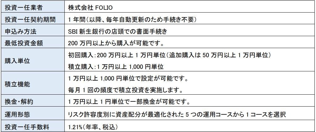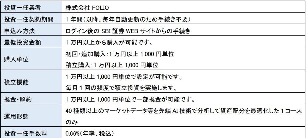 SBI 証券と FOLIO は、多様な投資一任サービスの提供を可能にするシステムプラットフォーム「4RAP」の特性 を活かし、FOLIO が培ってきた AI 運用ノウハウを活用した『AI×投資一任(ラップ)』という新しいジャンルの投 資一任サービスを提供しています。今後も、「顧客中心主義」のもと、長期の資産形成に資する投資一任サービ スを提供し、お客さまのニーズに合わせて資産形成を支援していきます。