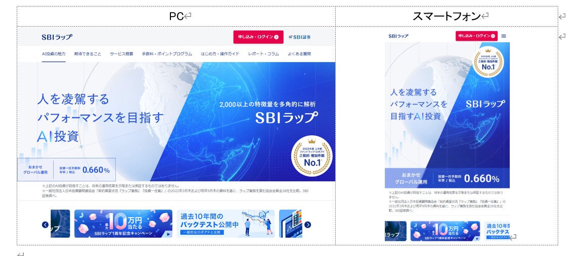 1周年に合わせて、よりSBIラップの魅力を伝えるべく「SBIラップ」サービスサイトを大幅リニューアルしました。プロの投資家(人)よりも高度な運用を実現するために「SBIラップ」のAI投資が目指すことや期待できることをよりわかりやすくご紹介していますので、この機会に是非ご覧ください。