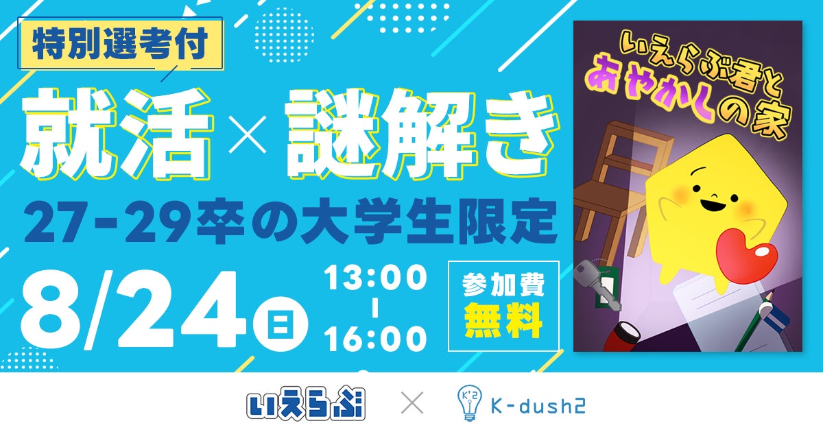不動産業界特化のDX支援サービスを展開する、株式会社いえらぶGROUP(本社:東京都新宿区、代表取締役:岩名泰介、 以下「いえらぶGROUP」)は、慶應義塾大学の謎解き制作団体「K-dush2」と協力し、「就活×謎解き」イベント第3回を開催します。