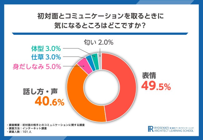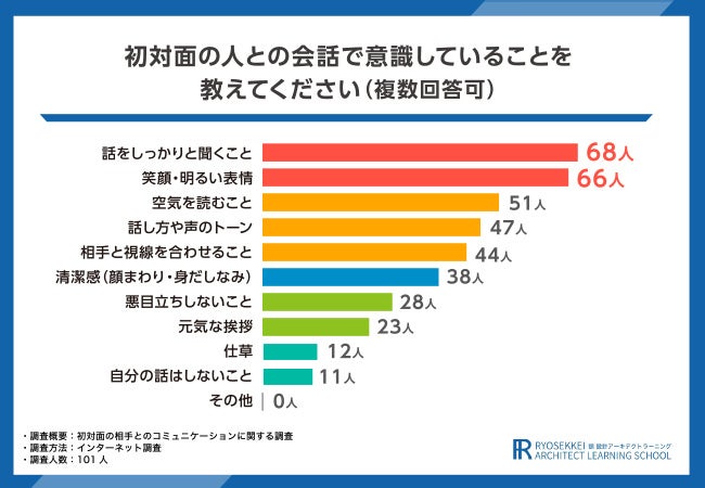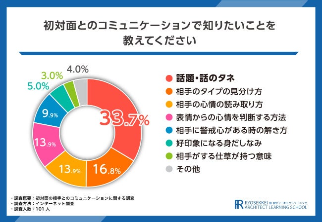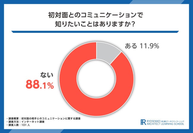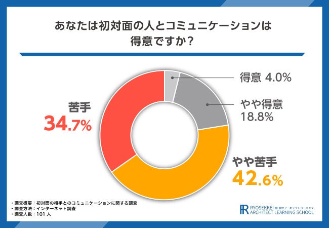 そこで今回、通信教育講座『諒設計アーキテクトラーニング』(https://www.designlearn.co.jp/)を運営する株式会社新生技術開発研究所は、全国の男女101名を対象に「初対面の相手とのコミュニケーション」に関する調査を実施しました。